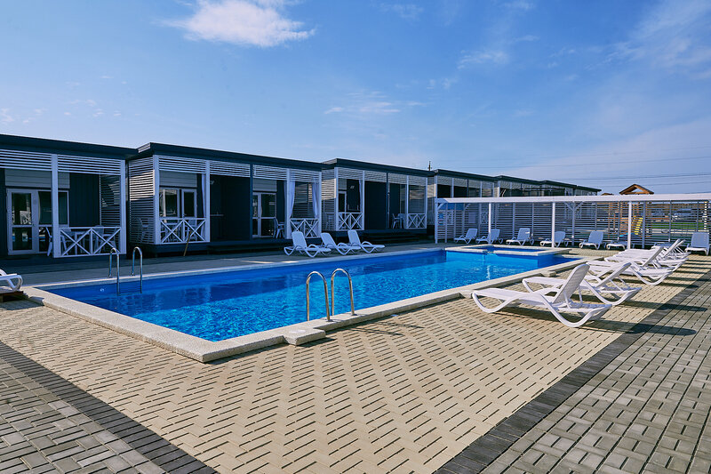 в поселке Оленевка на Западном побережье Крыма. База отдыха разместилась в экологически чистом уголке полуострова вдали от шумных трасс и городов, ближайший город - Евпатория, находится в полутора часах езды, а до аэропорта Симферополя - 162 километра.