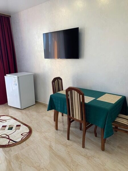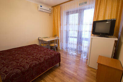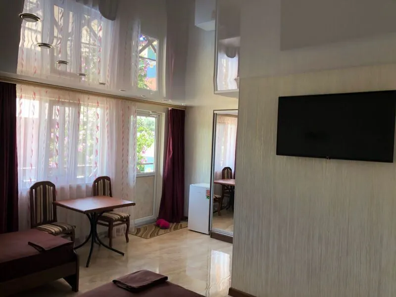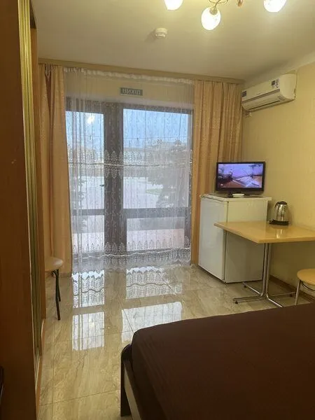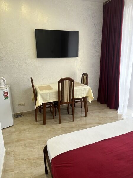 Номер с большим телевизором, холодильником, кондиционером, а так же есть вся мебель, электрочайник, посуда. Есть прекрасная лоджия со своим отдельным столиком.