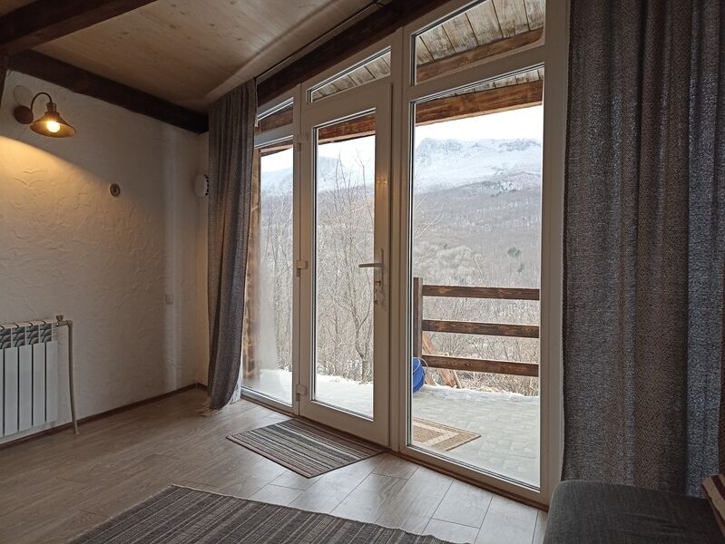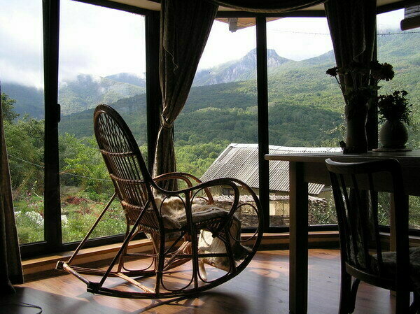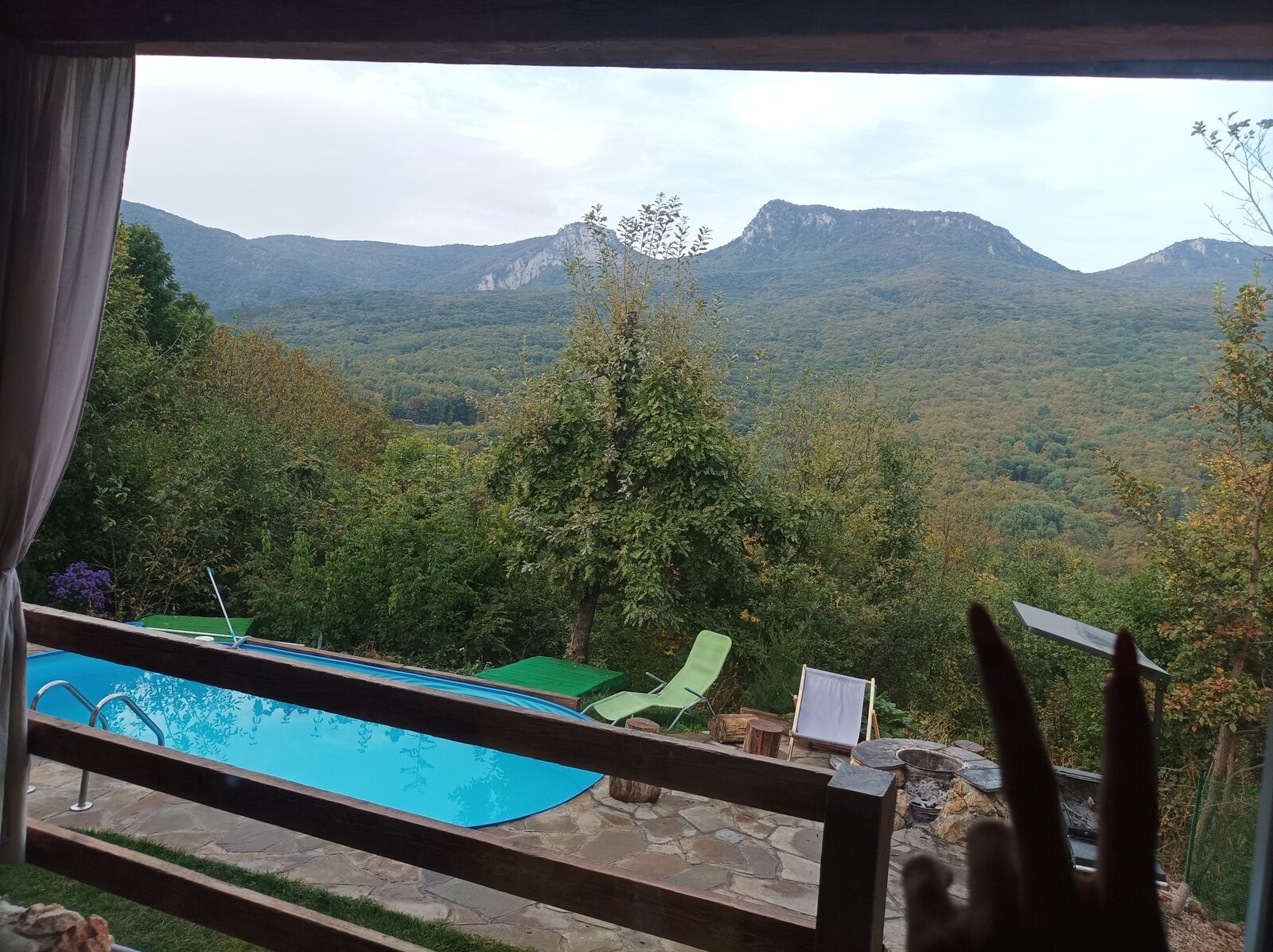 холодильником, большим буковым столом и мягким уголком. Во всех комнатах панорамные окна с видом на горы и бассейн. В интерьере использовано только натуральное дерево. На территории работает Wi - Fi.