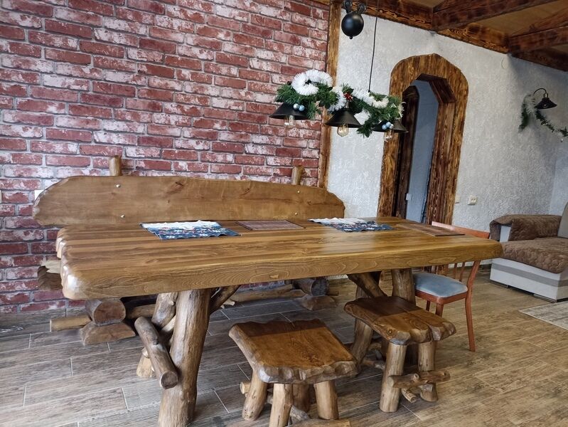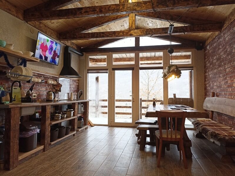 На первом этаже каминный зал площадью 40 квадратных метров с большим дубовым обеденным столом, мягкой мебелью. Большие окна обеспечивают панорамный вид на горы. Телевизор со спутниковой антенной обеспечивает широкий выбор российских и украинских каналов. Мощная акустика, DVD-плейер.