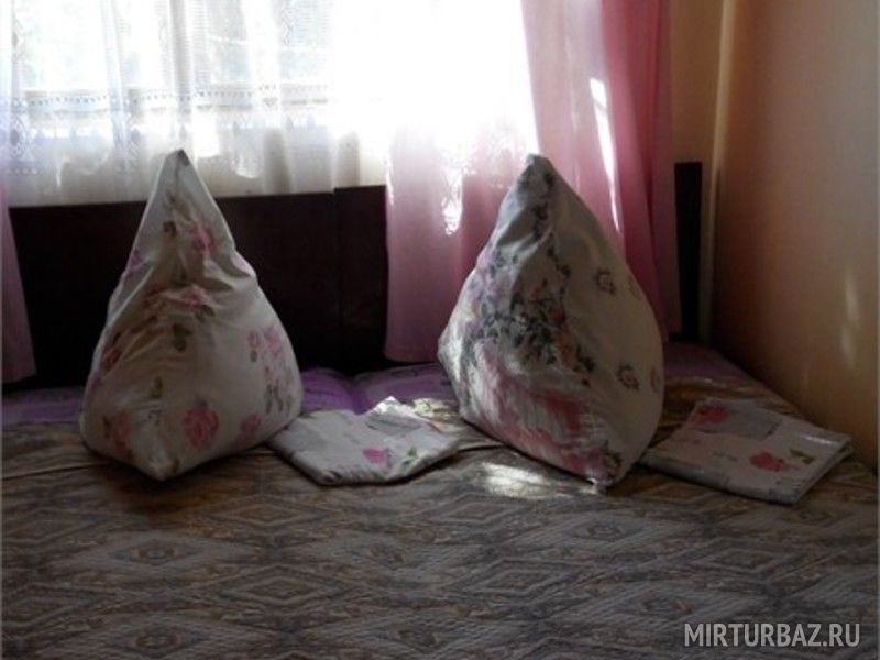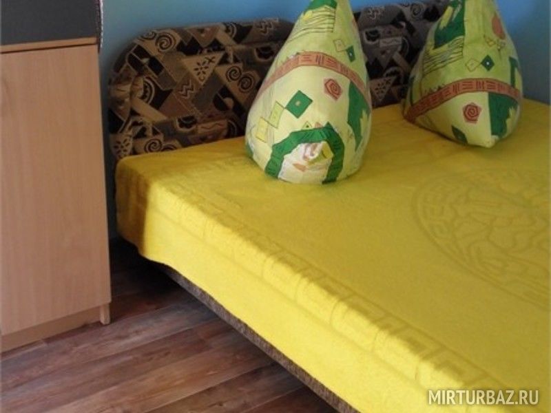 Зеленый домик (демократичный вариант) – двухэтажный домик, на каждом этаже по номеру на два человека. На домик один раздельный санузел и кухня. Каждый номер площадью 10 кв. м. В каждом номере: удобная мебель, холодильник (на 2 номера), электрочайник (на 2 номера), кухня (на 2 номера), набор посуды, телевизор с кабельным телевидением, WI-FI-интернет, полотенца, гигиенические принадлежности, раздельный санузел (душ, туалет, умывальник) на 2 номера.