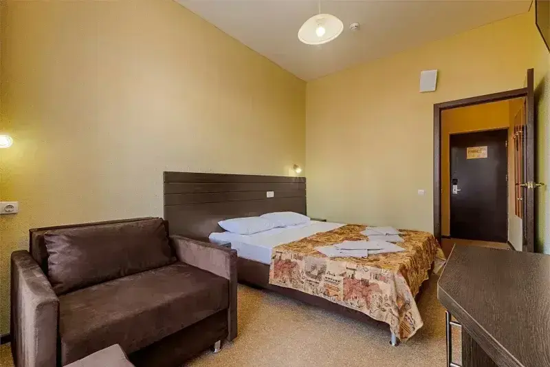авг. 2021 г.отдых удался)Отдыхала в августе. Отель хороший, а именно: хорошее расположение, кормят хорошо, на выбор, разнообразно, в комнате были чайник, посуда, фен, телевизор, кондиционер, холодильник, посуда, шкаф, зеркало, две кровати, стол, стул, две тумбочки. Одно неудобство - это матрацы, уж очень они жесткие, неудобные, качество сна страдало из-за этого.Шампунь и гель для душа нужно купить самим, выдают только мыло. Очень удобно, что есть тазик и сушилка на балконе. Еще понравилась территория, настоящий парк, ухаживают за ней. В пансионате есть камера хранения, что тоже очень удобно. Бассейн понравился, большой и много лежаков.