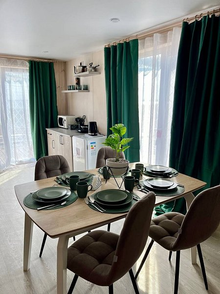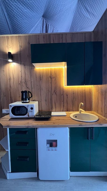 - мини-кухня со всем необходимым (холодильник, микроволновая печь, чайник, индукционная плита, столовые приборы, посуда, штопор);