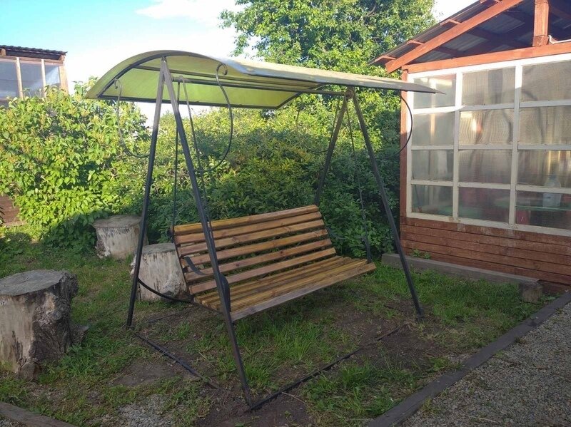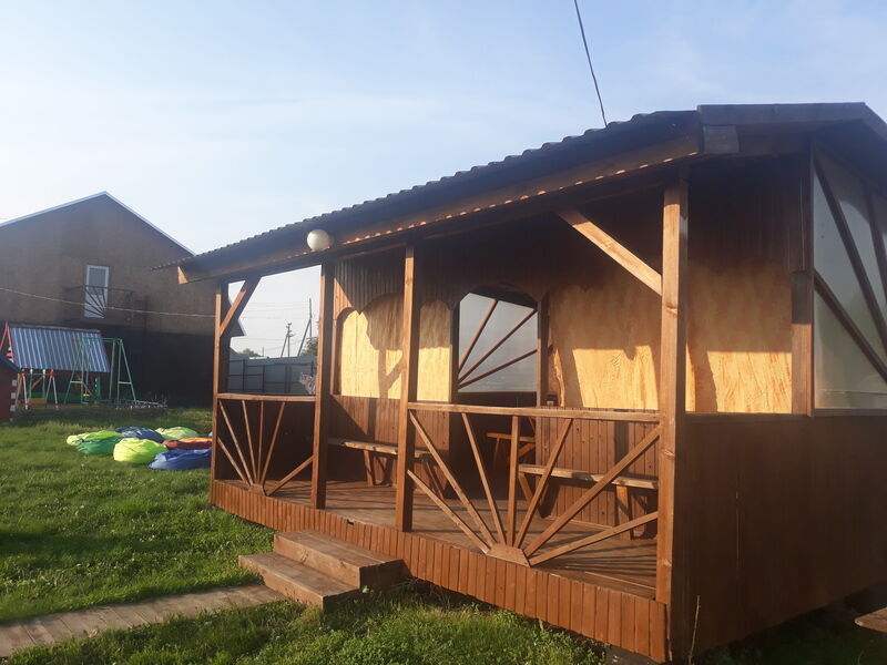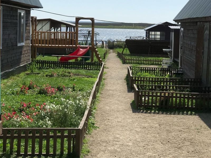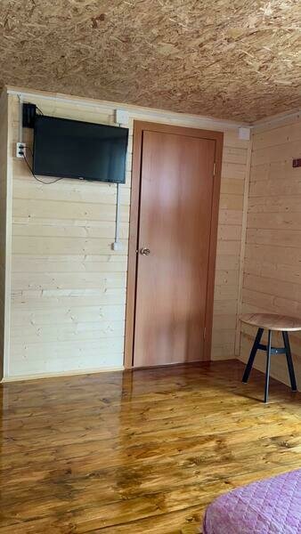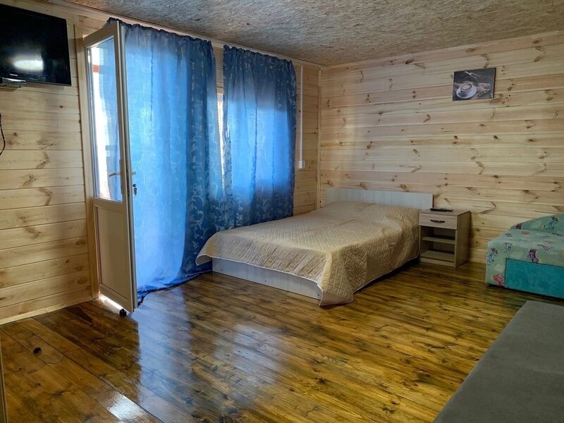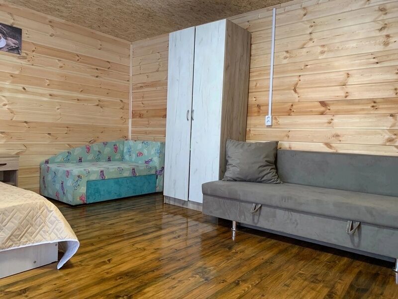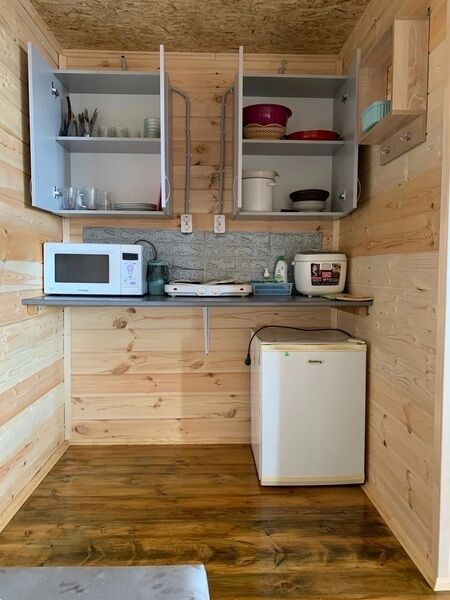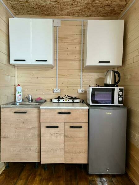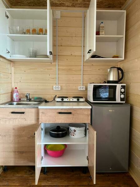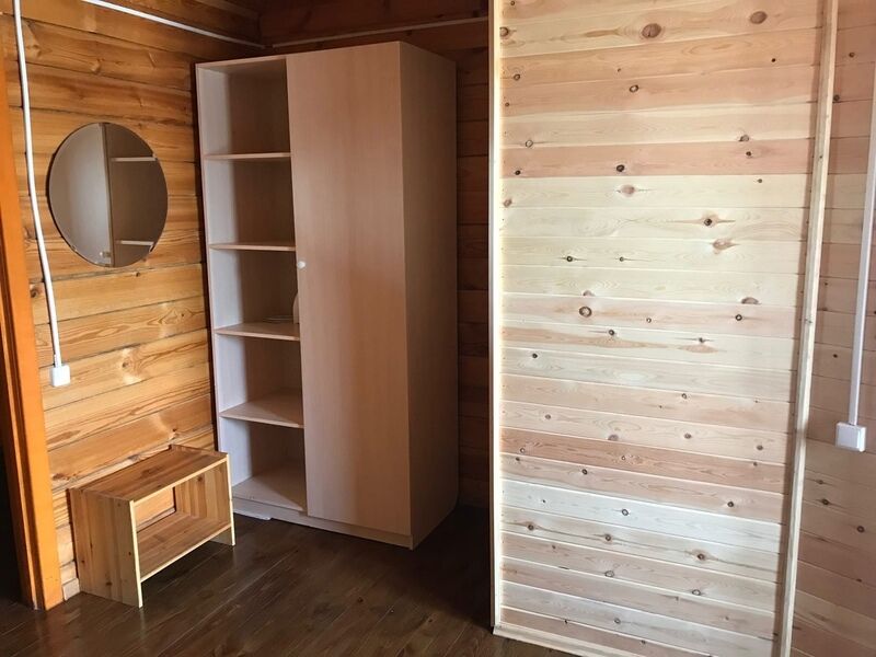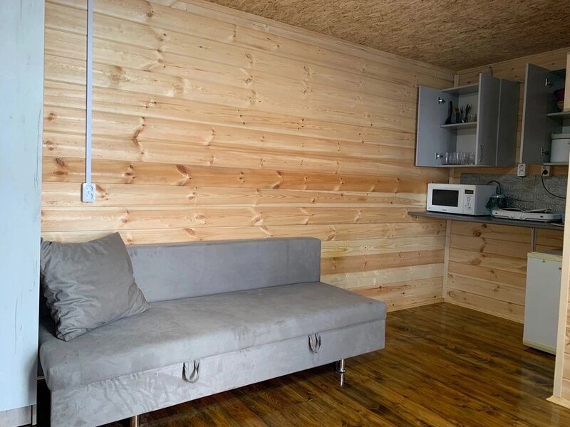 В домиках имеется двухспальная кровать, раскладывающийся диван, детская тахта. Атак же имеется мини-кухня и душ с горячей водой.