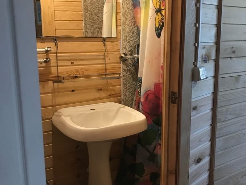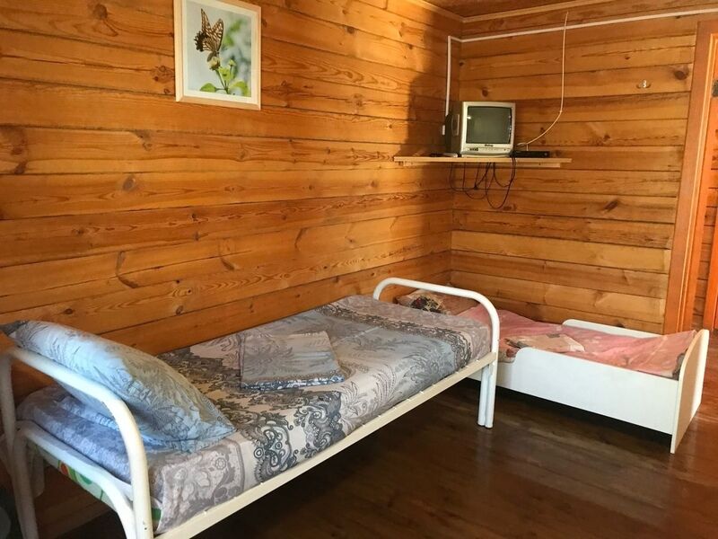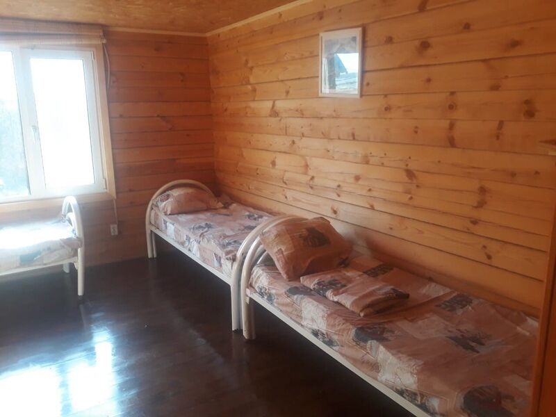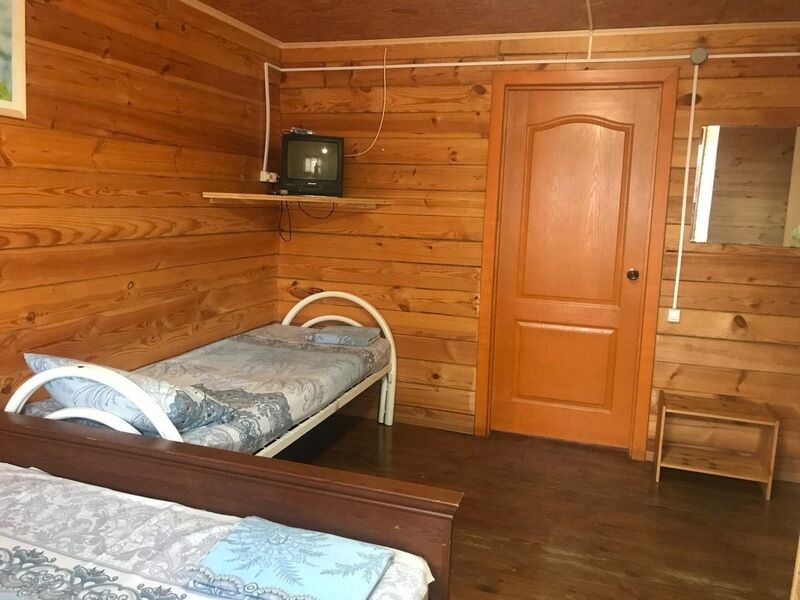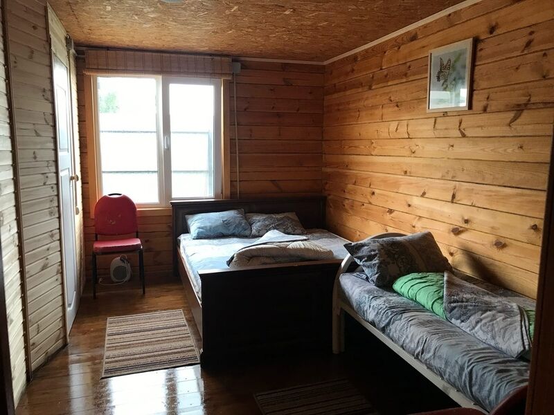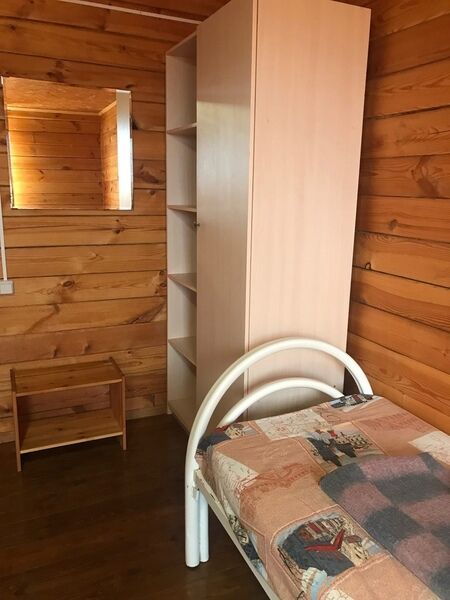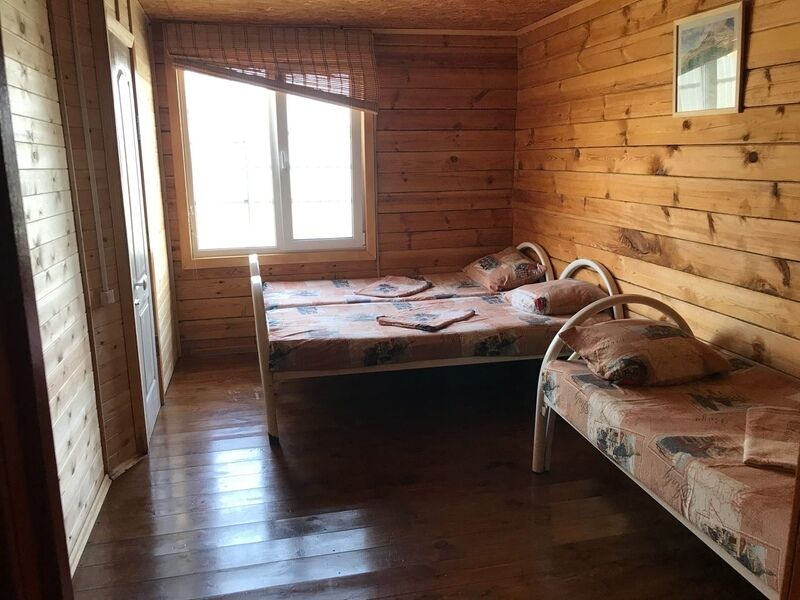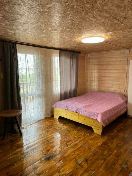 Комфортный двухэтажный деревянный коттедж, сдается каждый этаж отдельно, для каждого этажа отдельный вход. Вместимостью до 5 человек, включая детей. На каждом этаже есть все необходимое для комфортного проживания: двухспальная кровать, односпальная кровать, небольшой диван, кухня, душевая кабина и санузел с раковиной. Так же имеется терраса с садовой мебелью с видом на озеро.