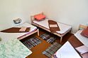 2 односпальные кровати, доп.место: раскладушка/ кровать, стеллаж для одежды, стол, чайник. С/у, душ на территории.