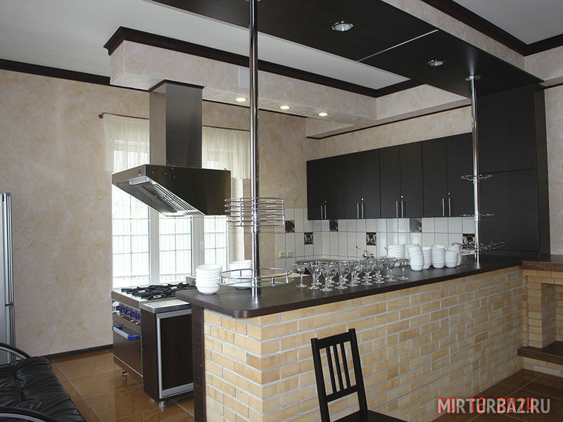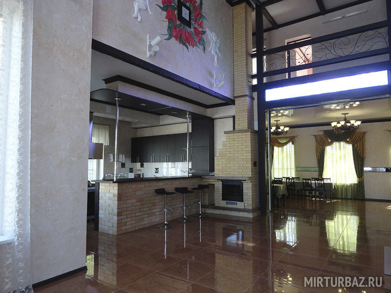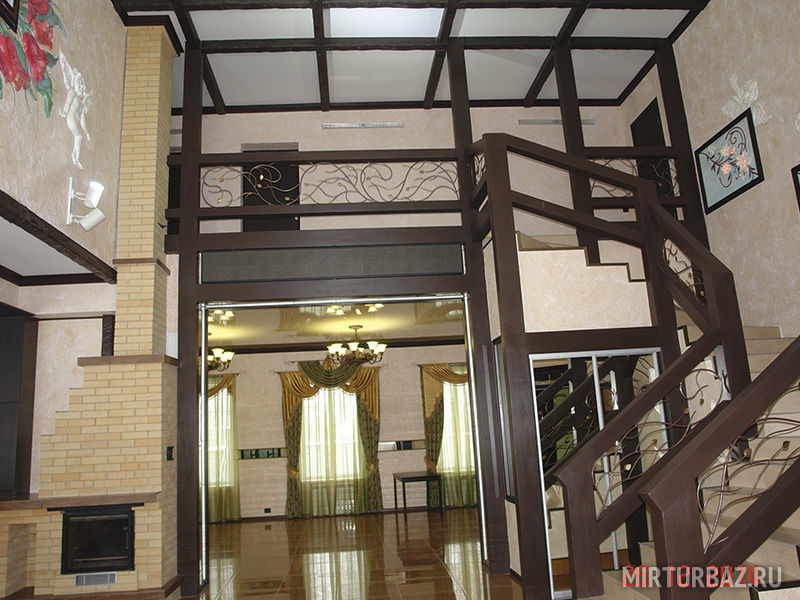 На первом этаже расположены сауны, банкетный зал и кухня, на втором этаже – спальни.