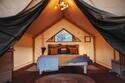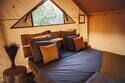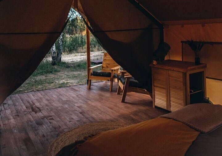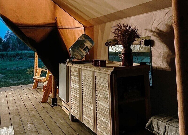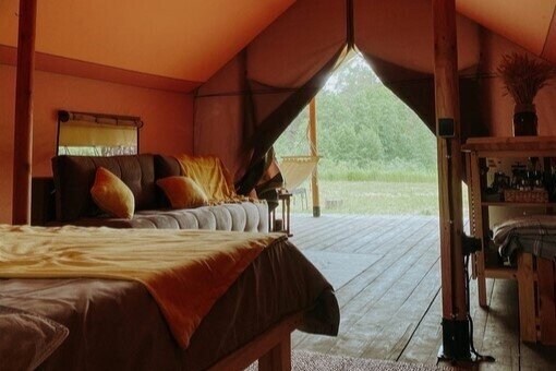 Территория глэмпинга полностью огорожена, обеспечивая приватность и безопасность для гостей. Внутри глэмпинга расположены 4 уютных сафари-тента различной вместимости и комплектации. Внутри каждого тента есть все необходимое для комфортного проживания, включая деревянную кровать ручной работы, мягкий матрас, свежее постельное белье и мини-кухню с бытовой техникой и посудой для приготовления пищи. Гости могут привезти продукты с собой или посетить ближайший магазин, который находится в 5 км от глэмпинга.