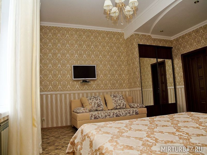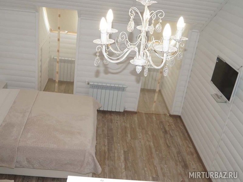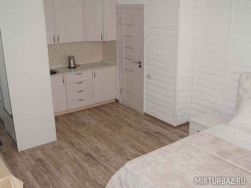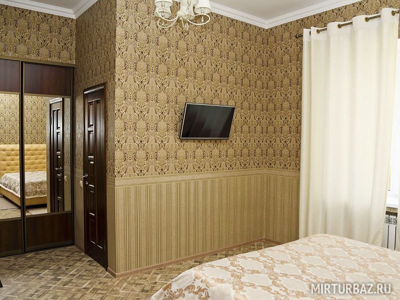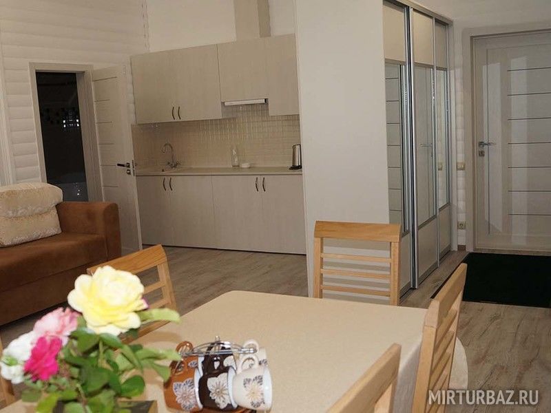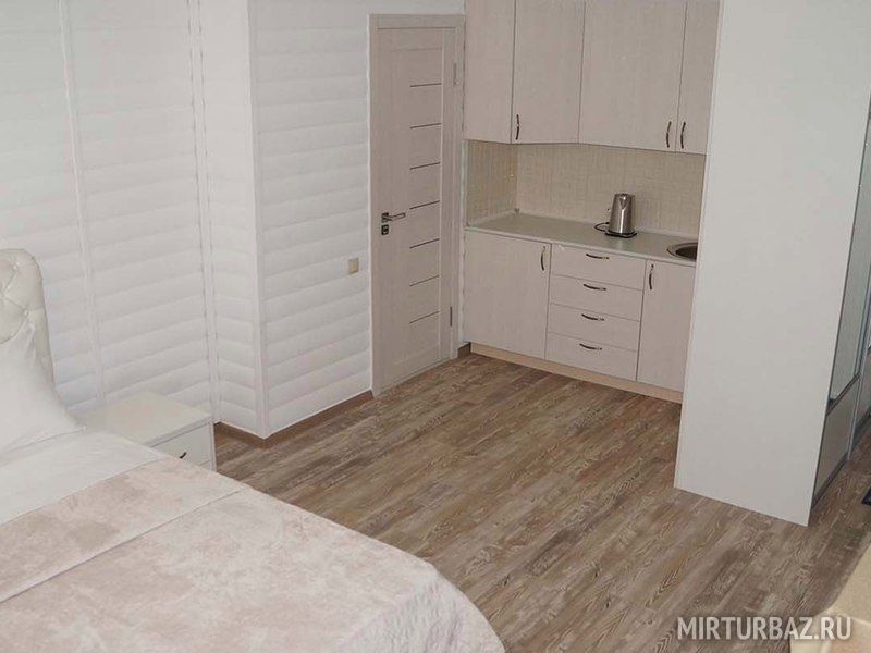 В номере имеется удобный шкаф-купе для одежды, стол. Ванная: джакузи, унитаз, умывальник, зеркало. Полотенца, туалетные принадлежности. Также предоставляются кухонные принадлежности и посуда.