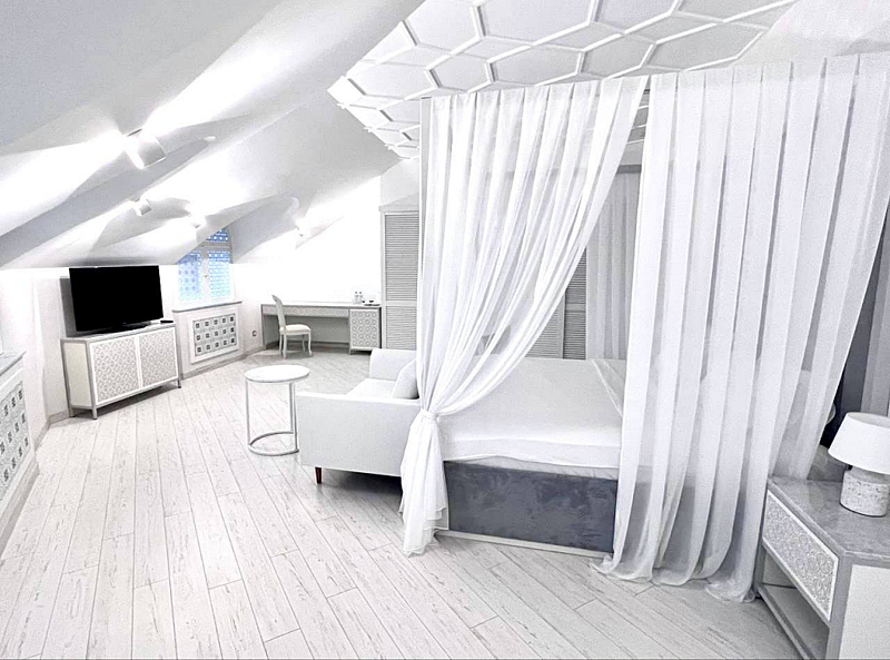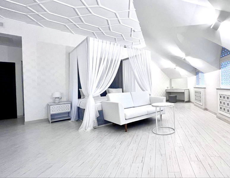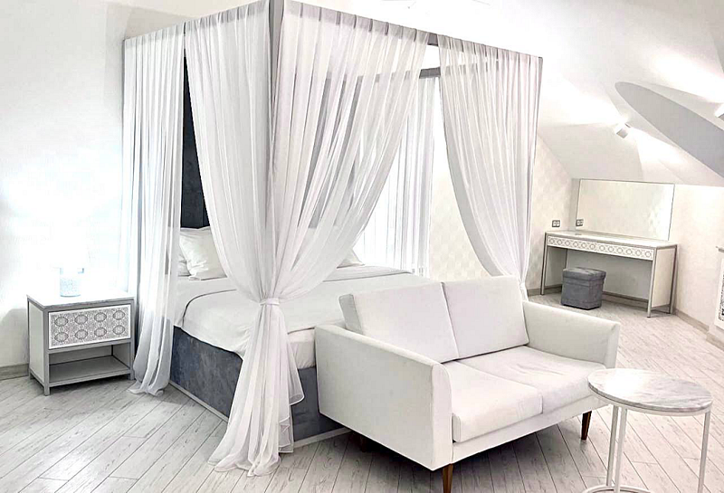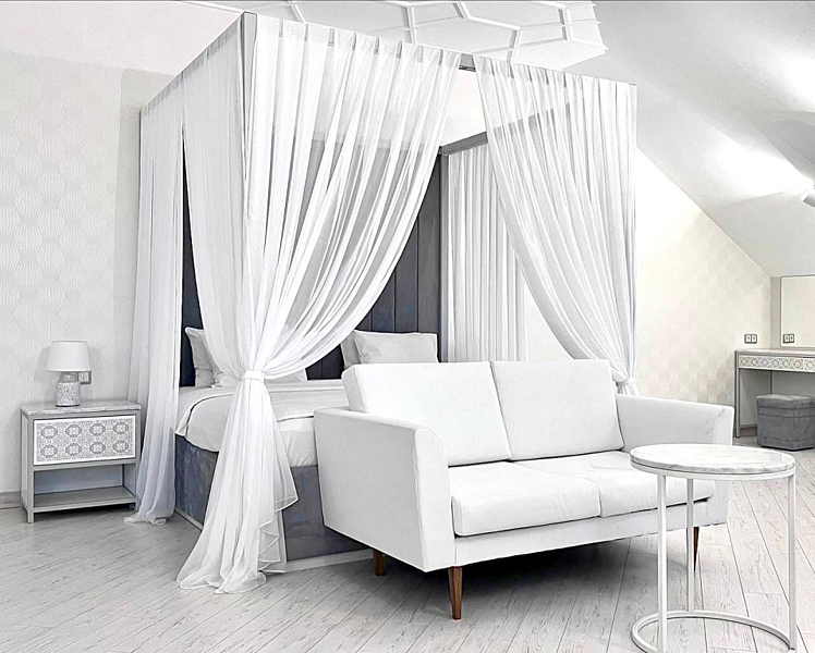 Люкс — это просторный однокомнатный номер площадью до 40 кв.м. , большой двуспальной кроватью, отдельной гардеробной и современной ванной комнатой с большой белоснежной ванной — идеальное место, чтобы восстановить жизненные силы. Стильный дизайн и удобная атмосфера порадует вас и позволит в полной мере насладиться отдыхом.