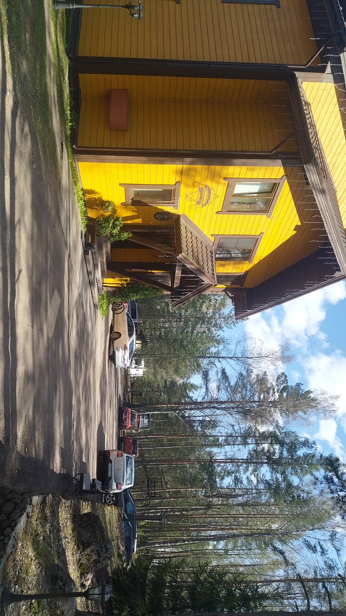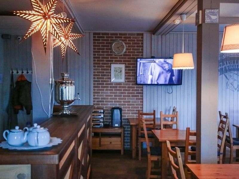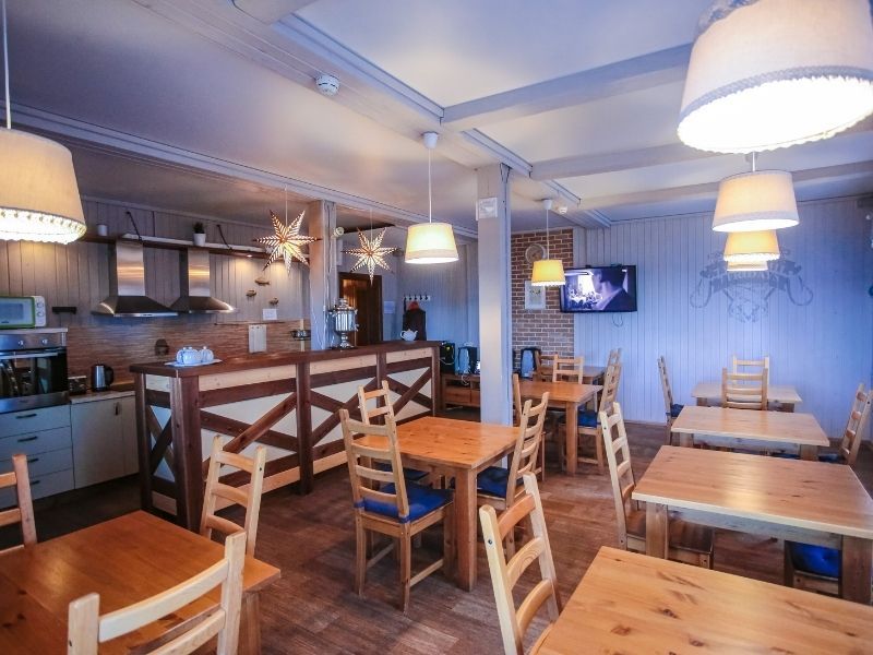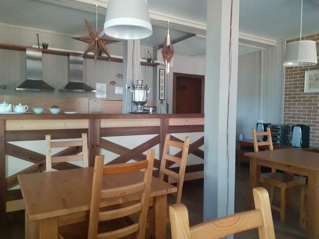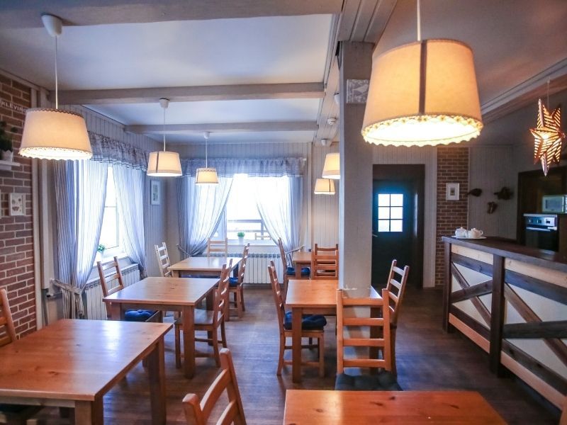 На первом этаже основного корпуса расположена кухня-столовая. В течение дня гости, расположенных в корпусе номеров, могут воспользоваться ей и приготовить еду: кухня оборудована двумя электроплитами, духовкой, посудомоечной машиной, холодильником, посудой для сервировки и готовки. В столовой есть терраса с видом на Вуоксу. Летом здесь особенно приятно организовать себе завтрак и полюбоваться природой.