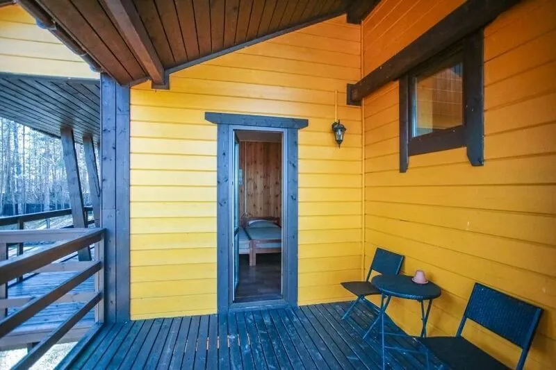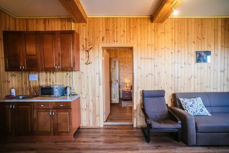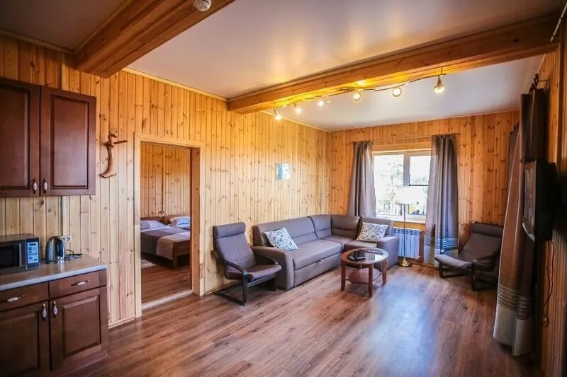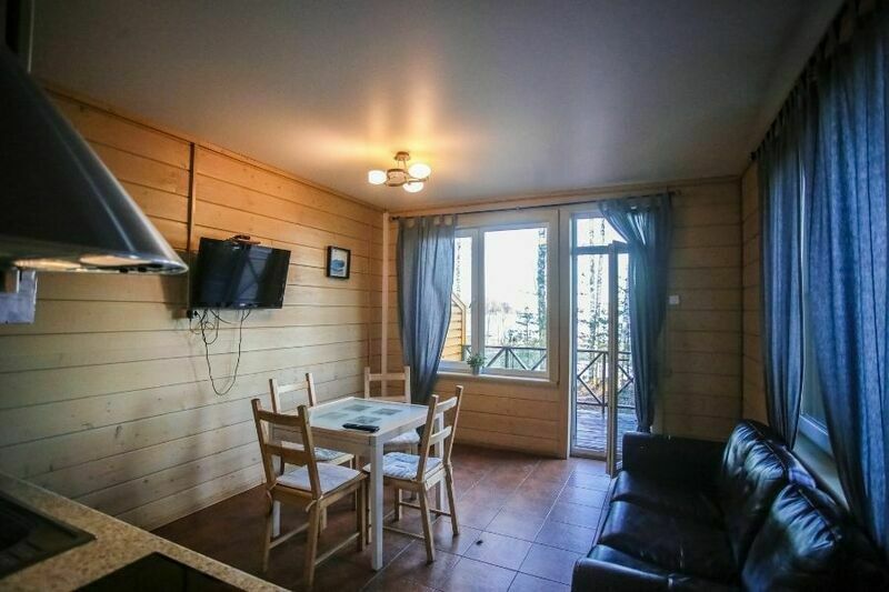 В дуплексе имеется небольшая гостиная-столовая на первом этаже, которая оборудована кухней и всем необходимым. На втором этаже находятся две спальни с раздельными кроватями. Из гостиной есть выход на небольшую террасу, где есть стол и стулья, а летом можно организовать завтрак с видом на лес. Прямо рядом с коттеджем, где расположен Дуплекс, есть своя беседка с мангалом. Для удобства всех гостей в дуплексе есть 2 санузла с тёплым полом.