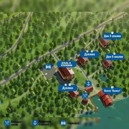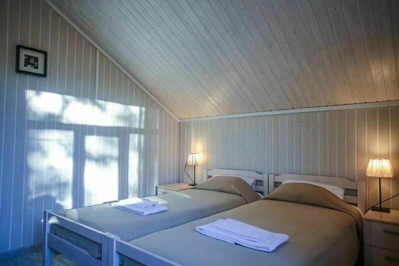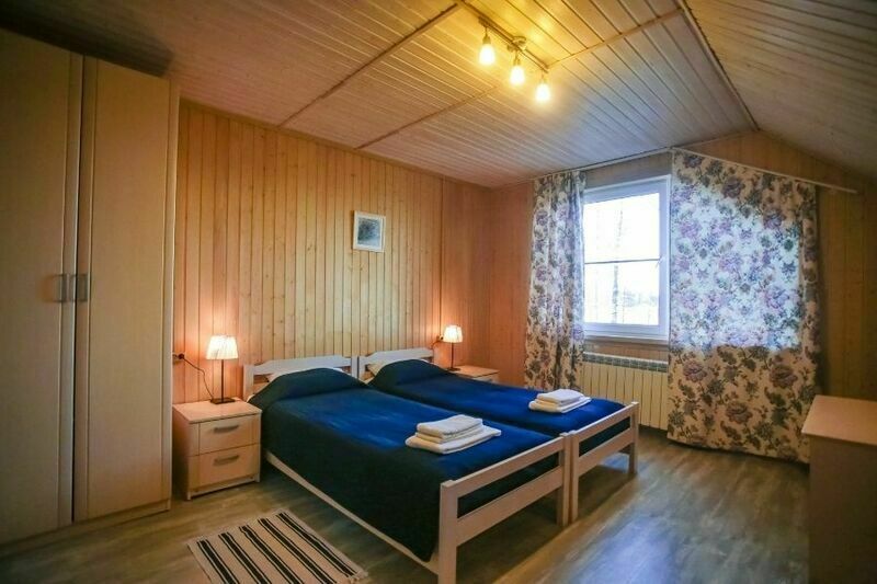 На Вилле синий речной цвет в оформлении гостиной и спален, природные материалы. Просторная гостиная с оборудованной кухней, обеденной зоной и диваном. Также на первом этаже находятся сауна с душевой, 2 спальни с раздельными кроватями. На втором этаже находится одна спальня с ванной комнатой, оборудованной душем. Рядом с Виллой есть свой мангал. Вместимость Виллы позволяет разместить 6 гостей, возможно дополнительное размещение 2х гостей в гостиной на первом этаже.