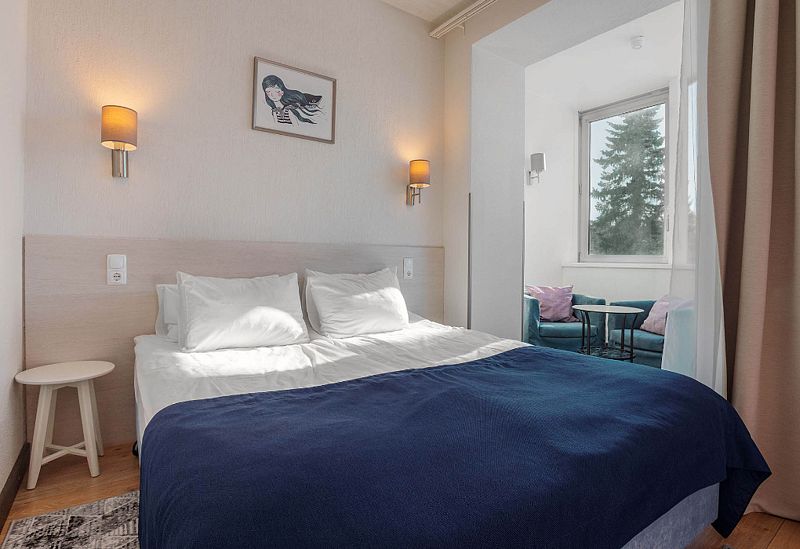 Отличается от стандартного номера чуть большей площадью за счет наличия уютного эркера с креслами и столиком. две односпальные кровати (80*200 см.), которые можно объединить в одну большую (160*200 см.)Услуги и удобства