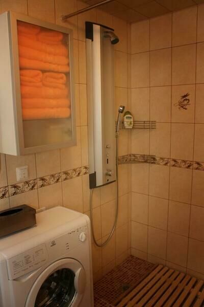 Сан.узел коттеджа снабжен душевой панелью, стационарным феном, стиральной машиной, мини набором бытовой химии (жидкое мыло, гель для душа, одноразовые салфетки средства личной гигиены, набор полотенец на 6 персон также прилагается.