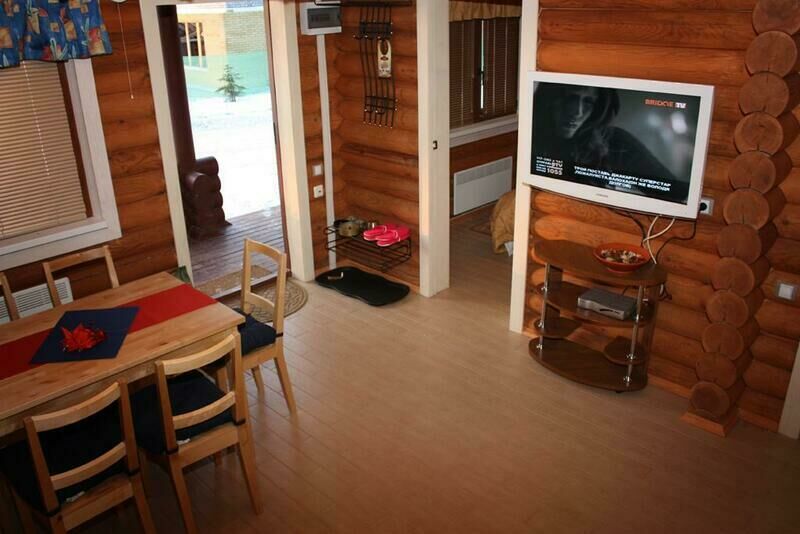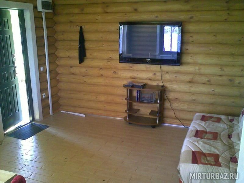 В коттедже есть гостиная с кухней (кухня - встроенная мебель с посудомоечной машиной, холодильником, варочной поверхностью на 2 конфорки, чайником, тостером, кофеваркой, вытяжкой, утюгом, столовыми приборами, сервизом чайным и обеденным все на 6 персон, варочной посудой, электрошашлычницей) с обеденным столом на 6 персон, с телевизионной ЖК панелью (с антеной НТВ плюс).