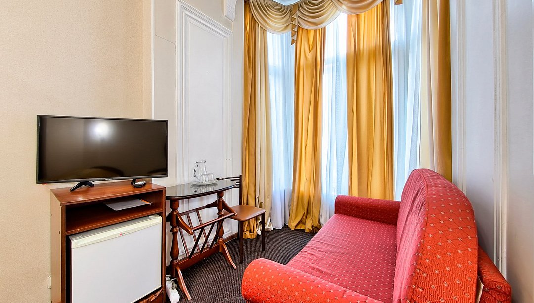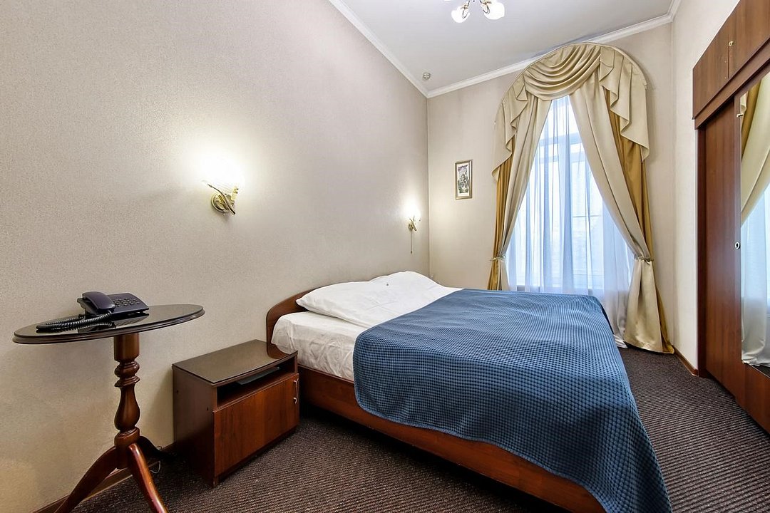 Этот комфортабельный номер оформлен в классическом стиле. В нем есть все необходимое для комфортного пребывания: мини-бар, LCD — телевизор, кондиционер, санузел с душевой кабиной. Из окон открывается вид на Невский проспект . Имеются также тихие номера, окна которых выходят во внутренний дворик. Возможно размещение как на двуспальной кровати, так и на двух раздельных кроватях. Бесплатный Wi-Fi предоставляется во всех номерах.Услуги и удобства