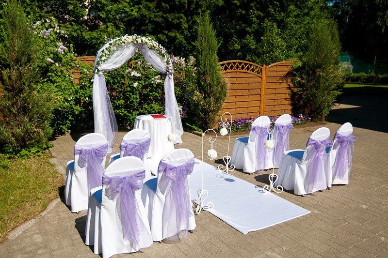 В летний период особенно популярна выездная регистрация, проводимая на фоне изумрудно-зеленой лужайки, украшенной традиционной аркой из цветов.