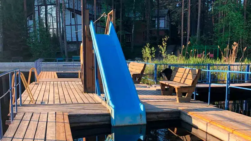 Красивое небольшое озеро с пляжем и деревянными лежаками, детская площадка, а за воротами красивый лес с дорожками.