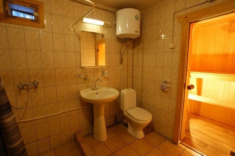 Отдавая предпочтение описываемому варианту, постояльцы выбирают комфортабельные апартаменты, оснащенные всем необходимым для удобного размещения. В коттедже есть современная мебель (от роскошной двуспальной кровати, до функционального кухонного гарнитура), бытовая и сантехника. Что касается вопроса совершения гигиенических процедур, то в вилле предусмотрен не только душ, но и сауна. Последняя становится наиболее желанной среди постояльцев, снимающих объект в зимний период.