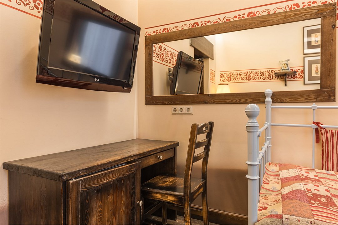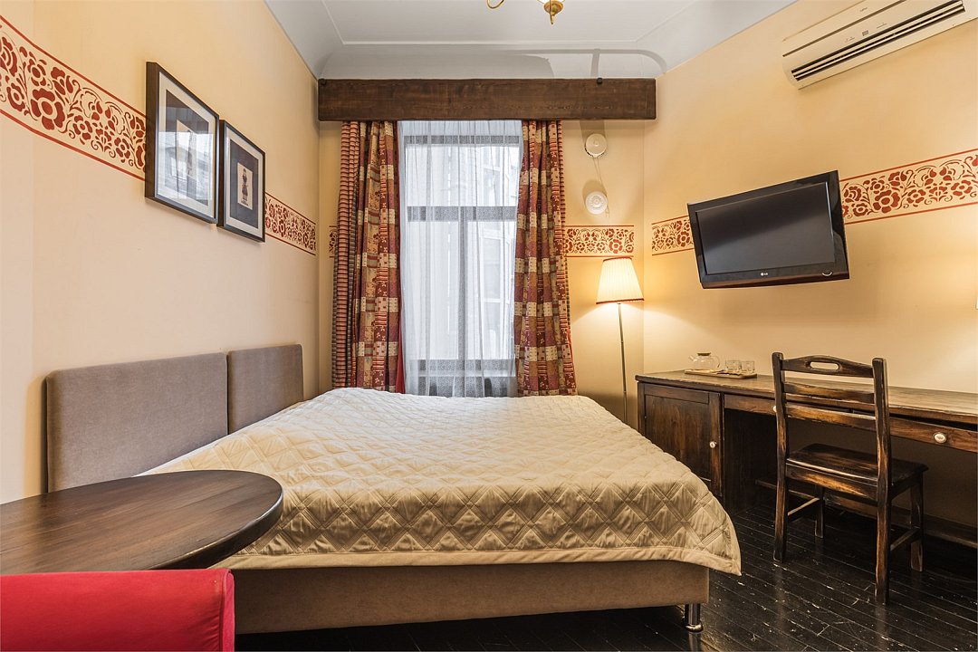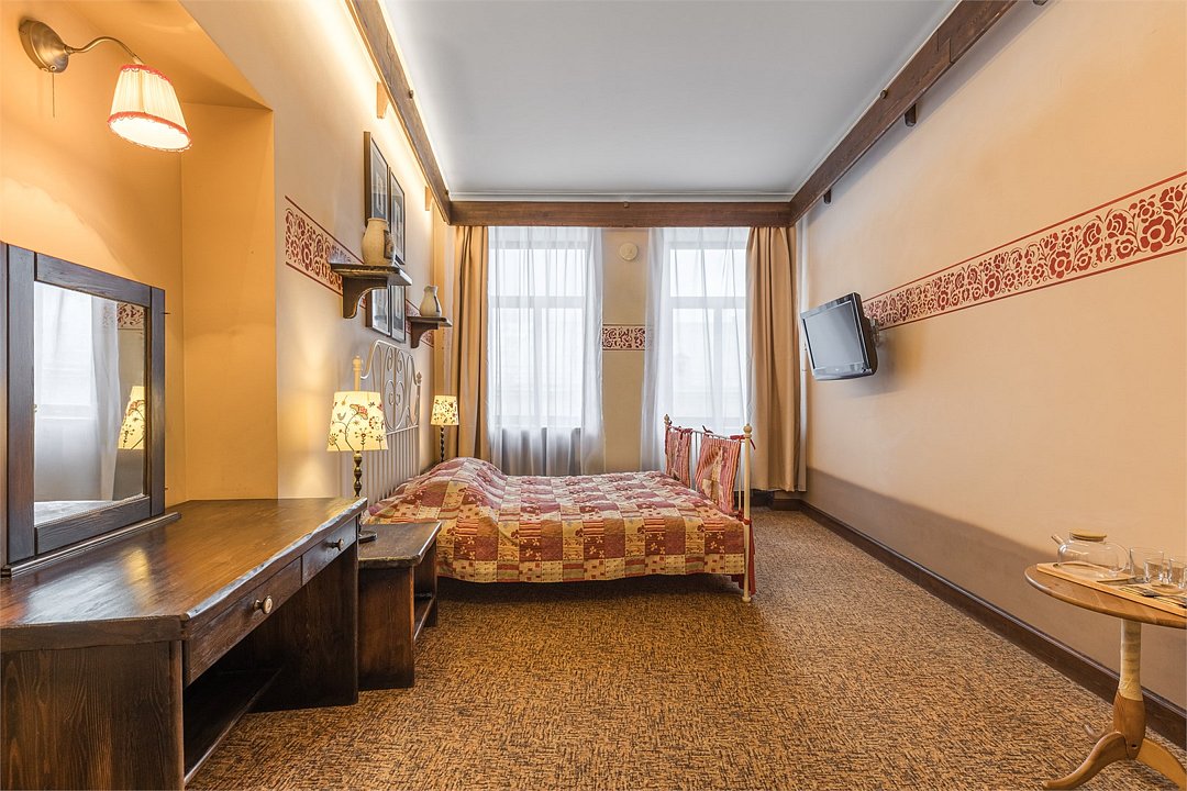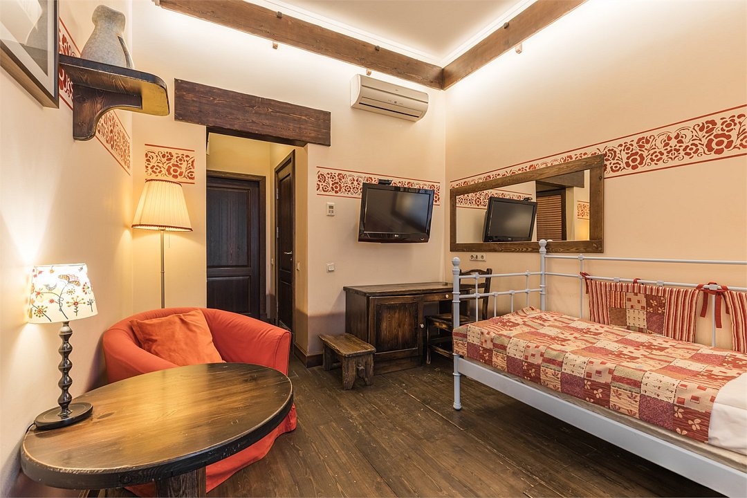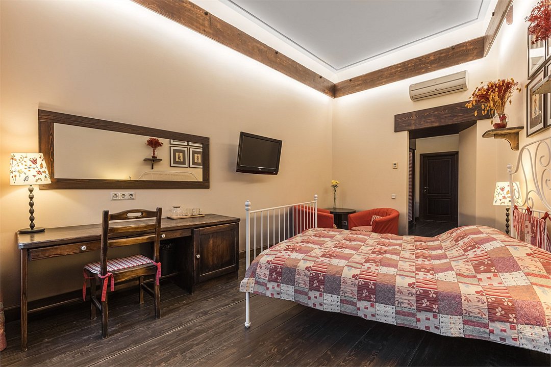 телевизор, Wi-Fi, кондиционер, светильник, фен, ванная комната, тапочки, кровать «Queen size», две односпальные кровати, шкаф для одежды, мебельный гарнитур, сейф, душ, кулер на этаже, вид во двор, стул, стол, туалет, мини-холодильник, антикварная мебель, затемняющая штораВ гостиничном номере