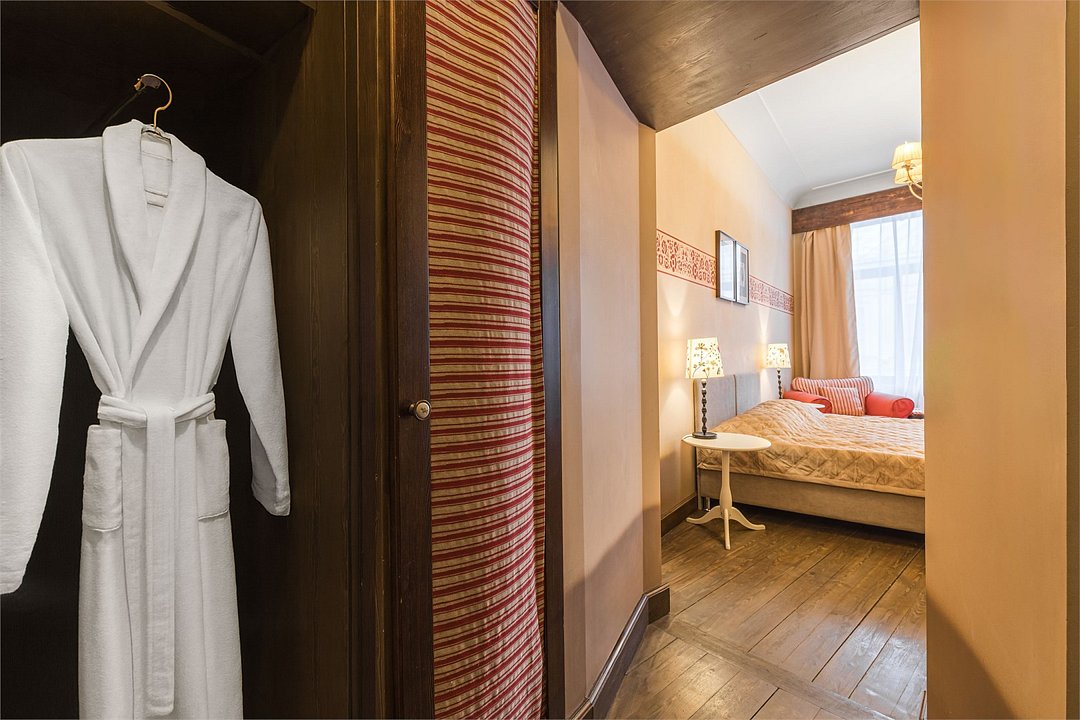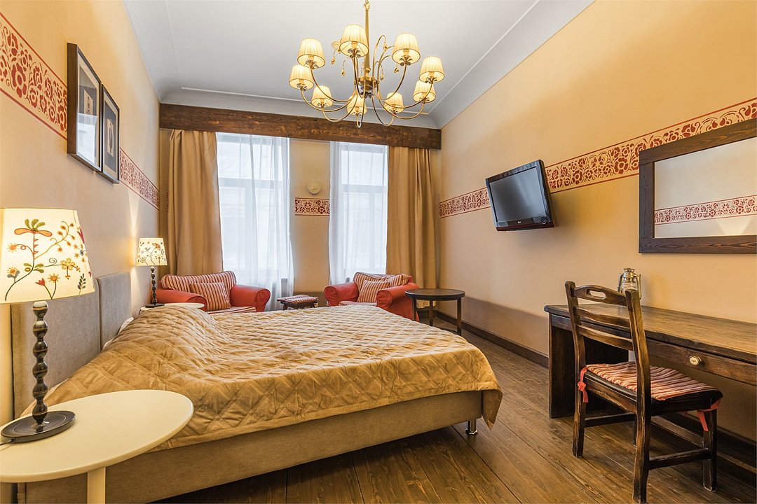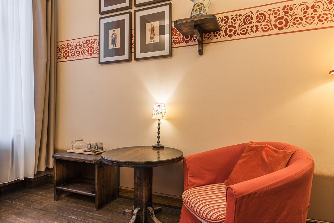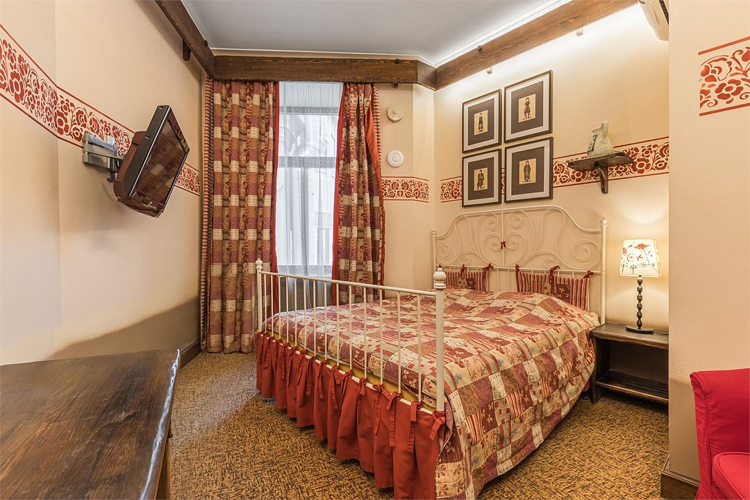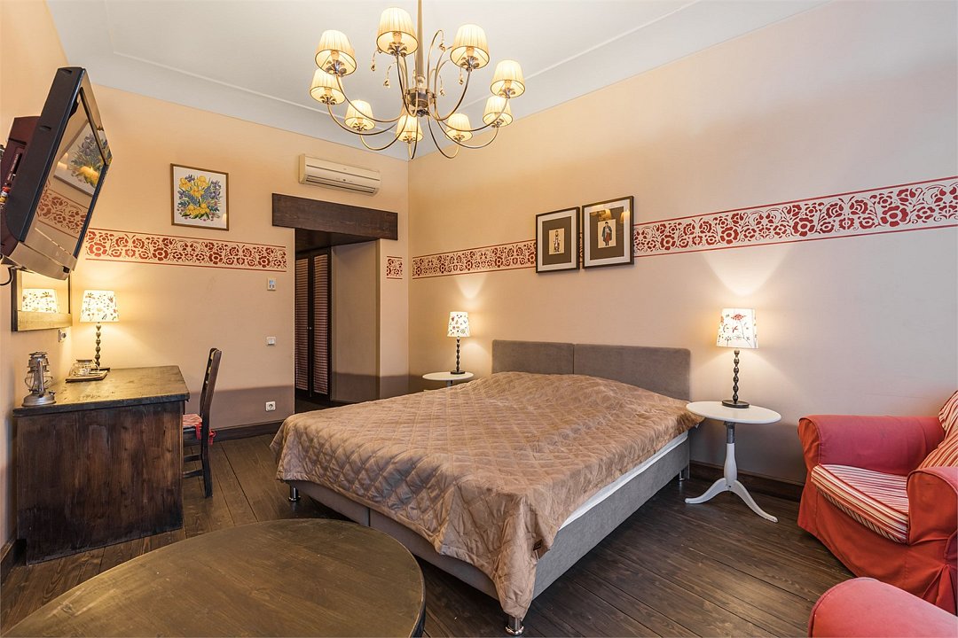телевизор, Wi-Fi, кондиционер, светильник, фен, ванная комната, тапочки, кровать «Queen size», две односпальные кровати, шкаф для одежды, мебельный гарнитур, сейф, душ, кулер на этаже, вид во двор, стул, стол, туалет, мини-холодильник, антикварная мебель, затемняющая штораВ гостиничном номере