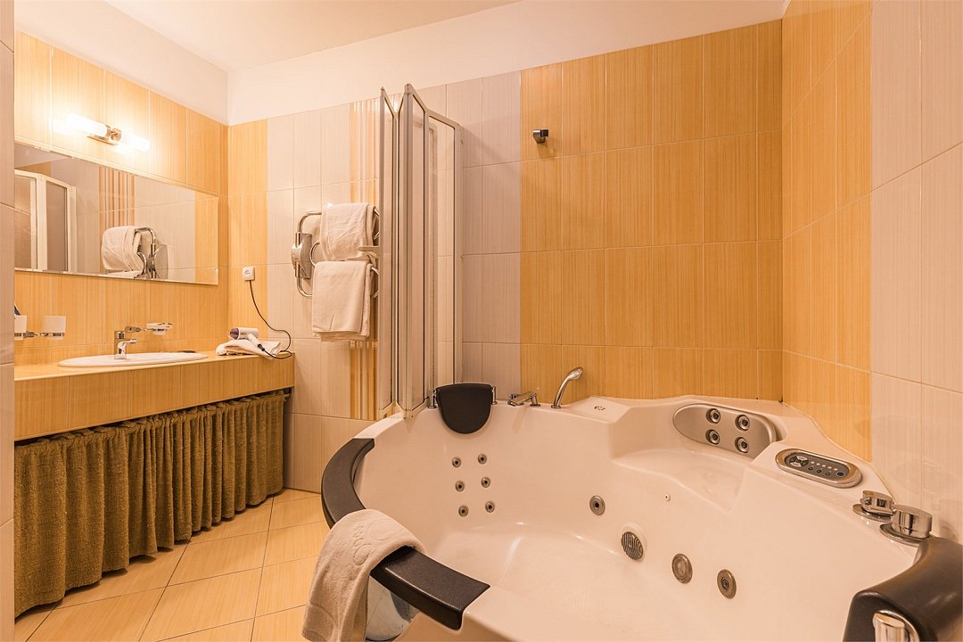 телевизор, Wi-Fi, кондиционер, светильник, фен, ванная комната, кровать «Queen size», две односпальные кровати, шкаф для одежды, мебельный гарнитур, сейф, вид на город, кулер на этаже, стул, стол, туалет, мини-холодильник, джакузиВ гостиничном номере