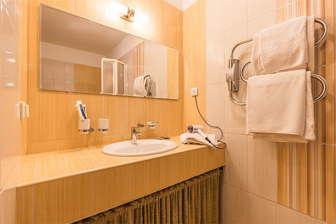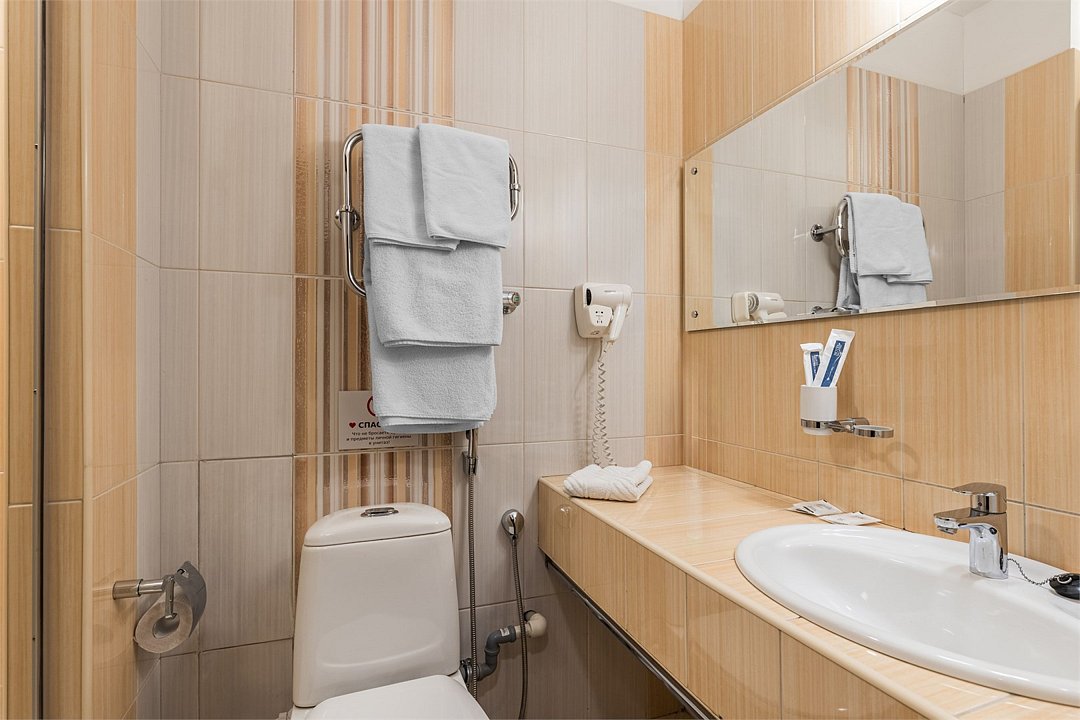 Стандартный двухместный номер для некурящих, с совмещенным сан. узлом (туалет и душ), феном, бесплатными туалетными принадлежностями и Wi-Fi. Во всех номерах есть двуспальная кровать, телевизор, сейф, холодильник, кондиционер, а также письменный стол. Возможно по предварительному запросу подготовить дополнительное спальное место - еврораскладушку. Максимальное размещение 3 взрослых и 1 ребёнок до 4-х лет без предоставления отдельного спального места. В зоне общего пользования на этаже есть кулер с горячей и холодной водой, микроволновая печь, утюг и гладильная доска.Услуги и удобства