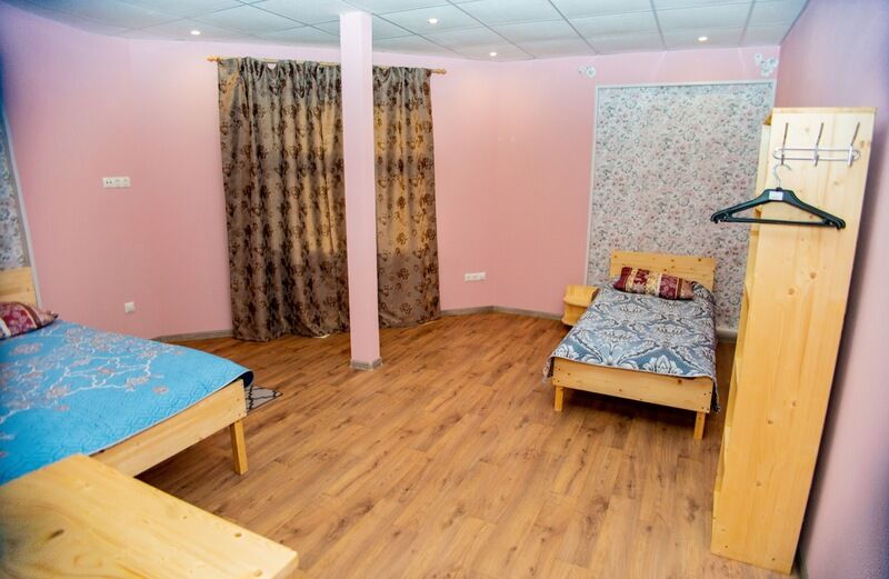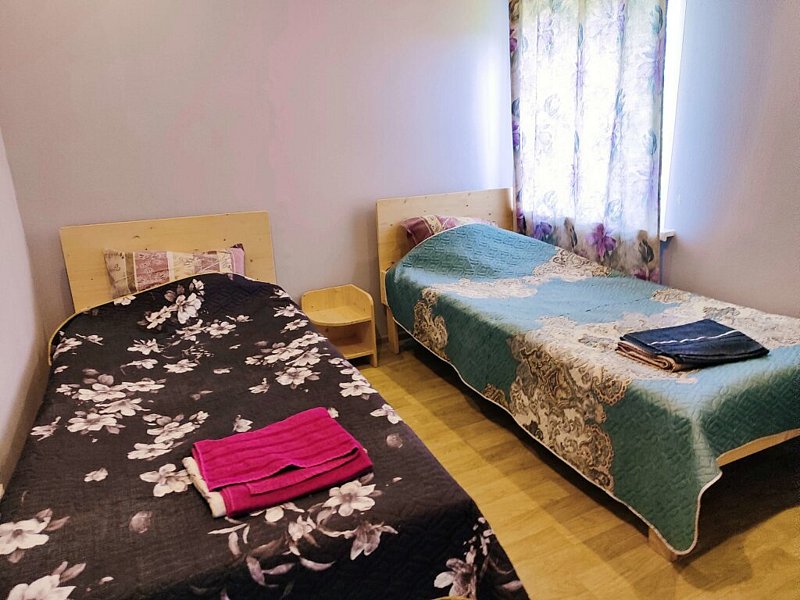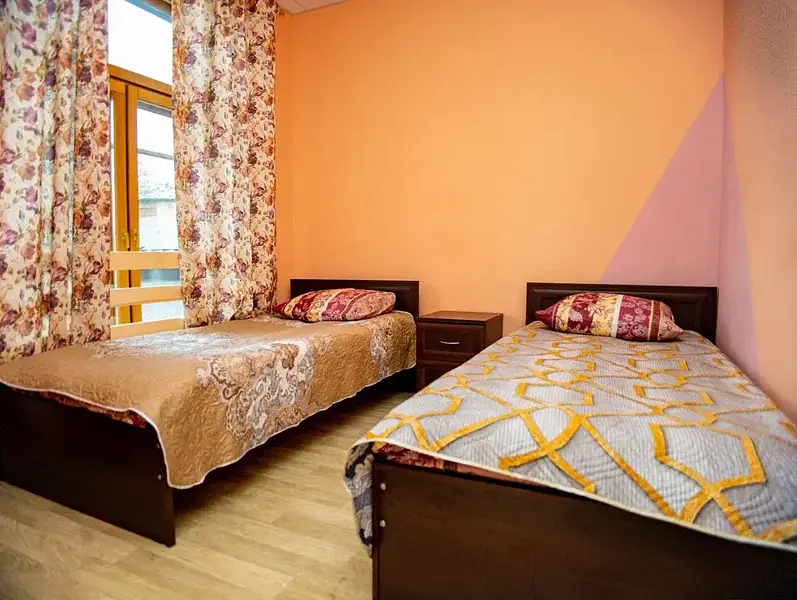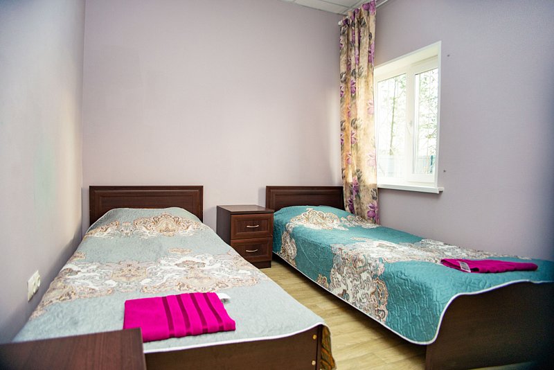 Номера с двумя односпальными кроватями (90 × 200 см), пеналом с полками для вещей и прикроватными тумбами. Постельное бельё включено.