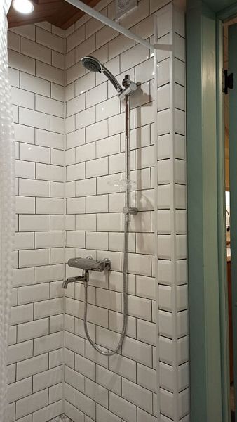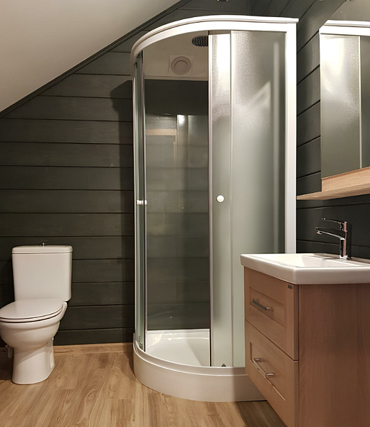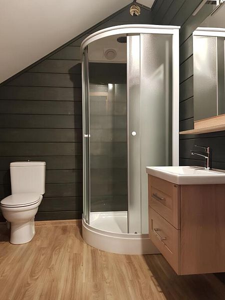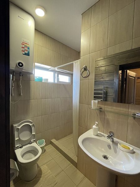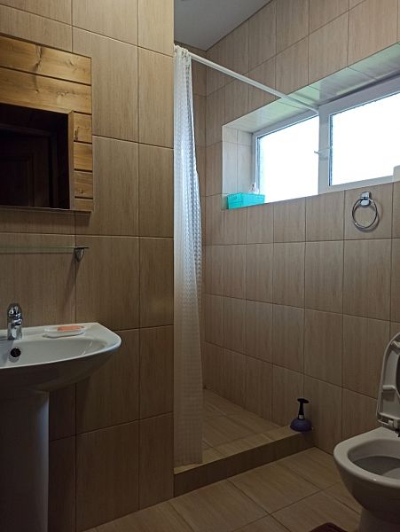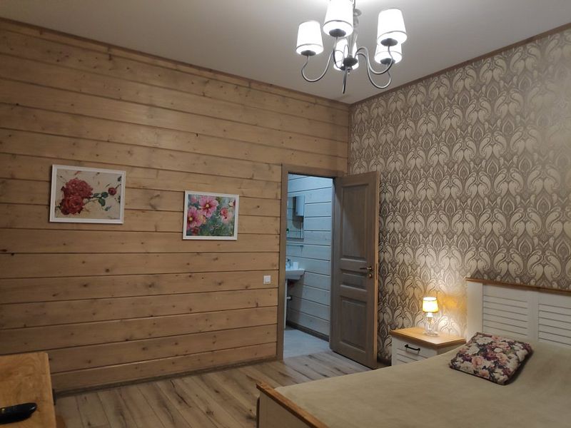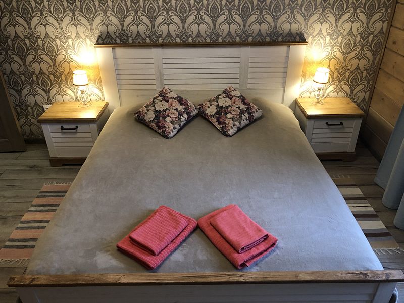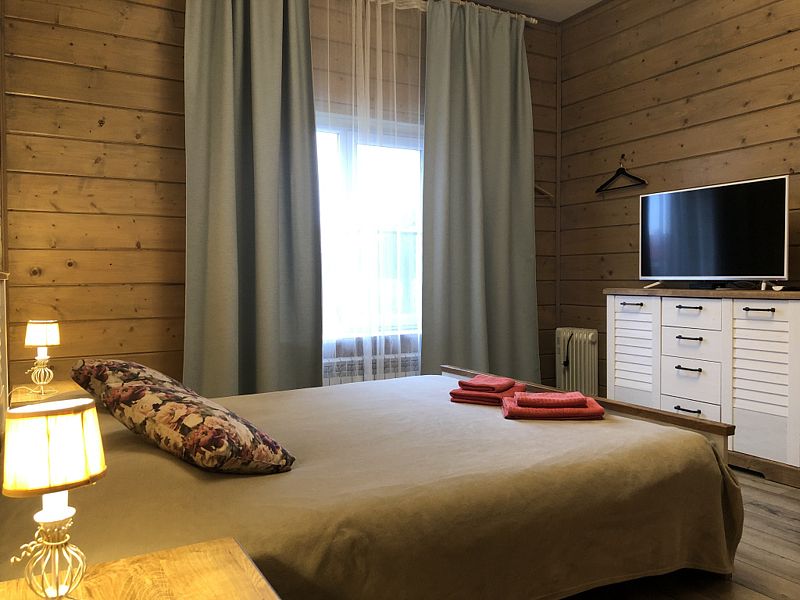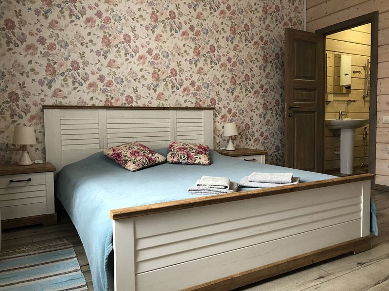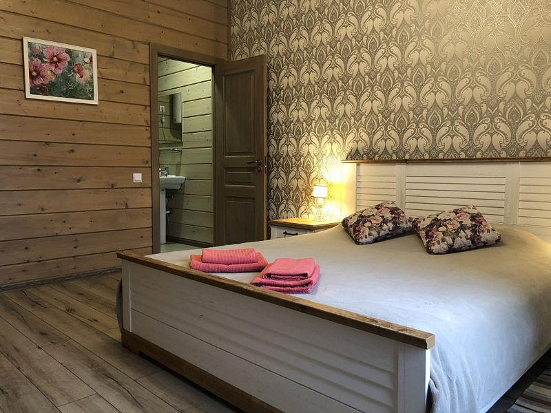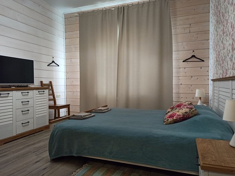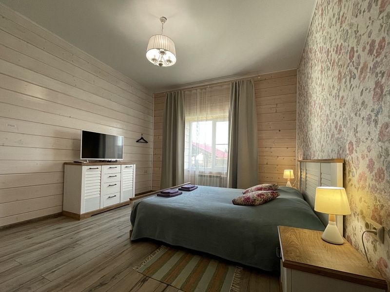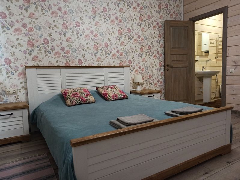 Номер с большой двуспальной кроватью в доме из трех комнат. Собственный санузел с душевой в номере. В доме есть просторная кухня-гостиная с холодильником, посудомоечной машиной и всем необходимым для приготовления и приема пищи.
