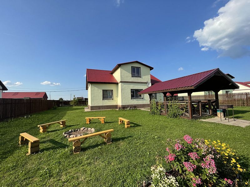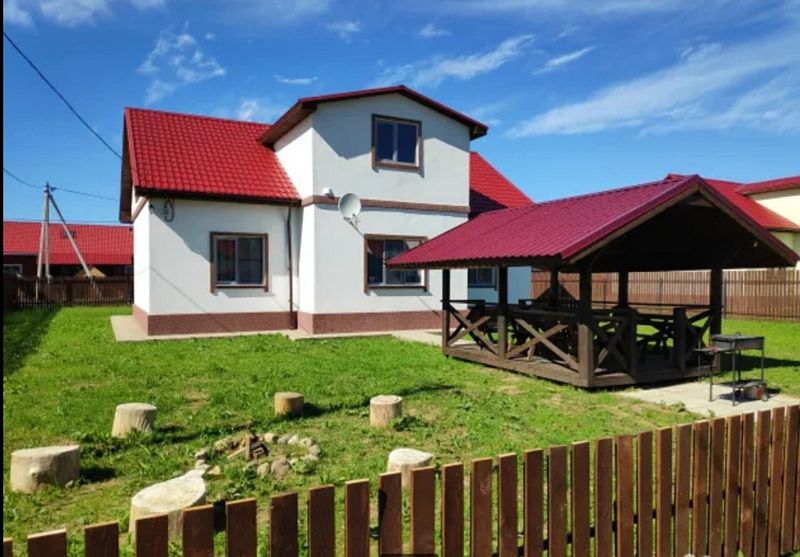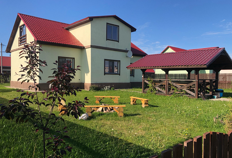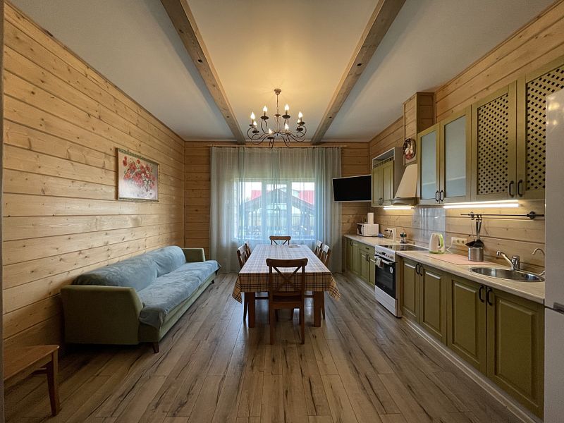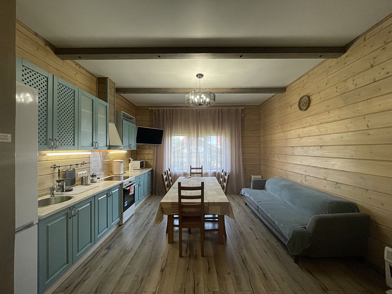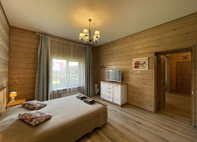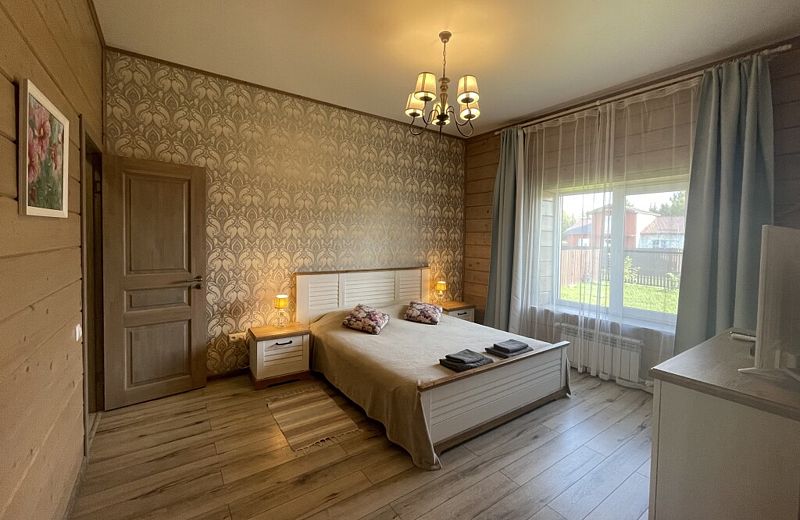 Дом с тремя спальнями. Вмещает до 10 гостей. 6 односпальных кроватей, 1 двуспальная 160х200 см, диван-кровать. 2 санузла. Спутниковое ТВ, Wi-Fi. Кухня-гостиная оборудована всей необходимой техникой и посудой. Постельные принадлежности, постельное белье и полотенца в комплекте. В распоряжении отдыхающих беседка с мангалом. Бесплатная парковка на участке. Имеется русская баня(дополнительная услуга).
