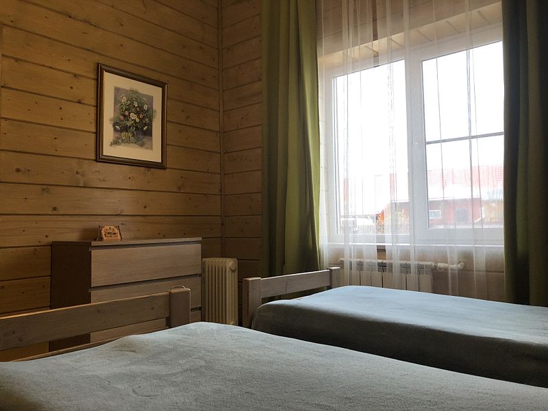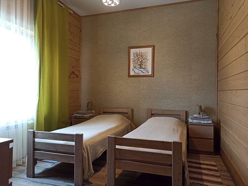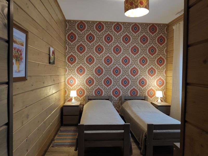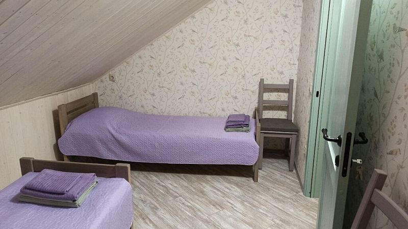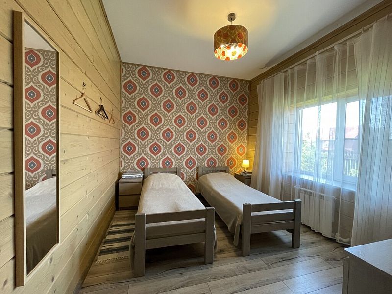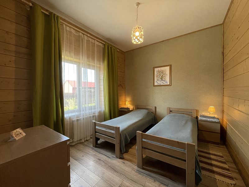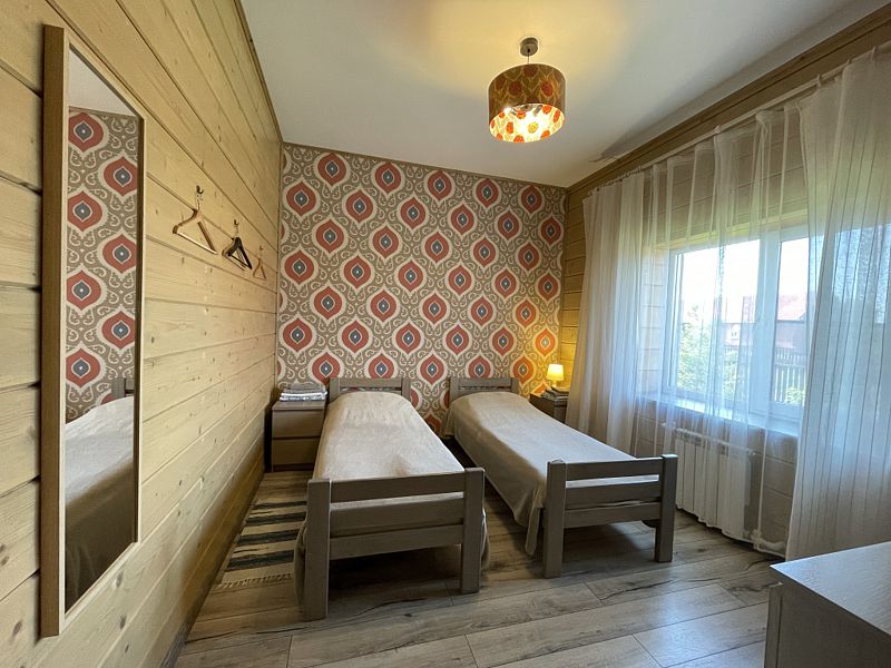Номер двумя односпальными кроватями и общим санузлом. Находится на втором этаже дома из пяти комнат. В доме есть просторная кухня-гостиная с холодильником, посудомоечной машиной и всем необходимым для приготовления и приема пищи.