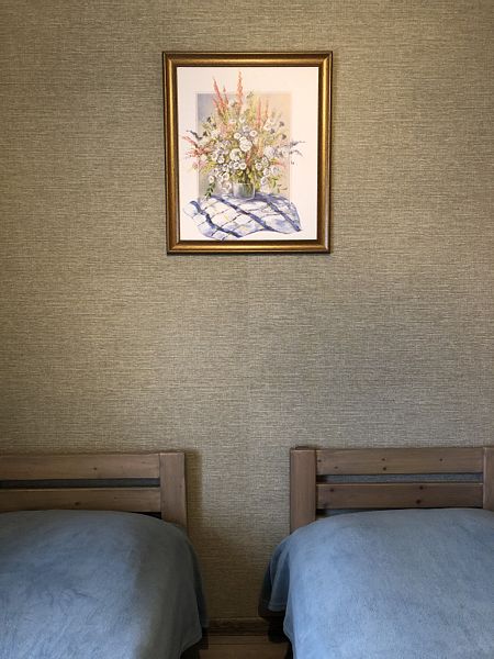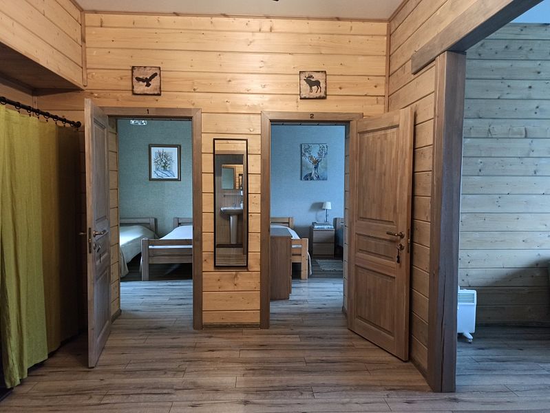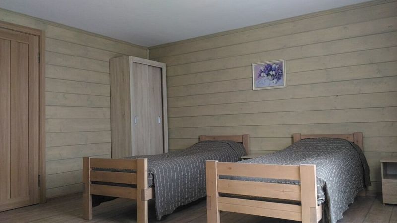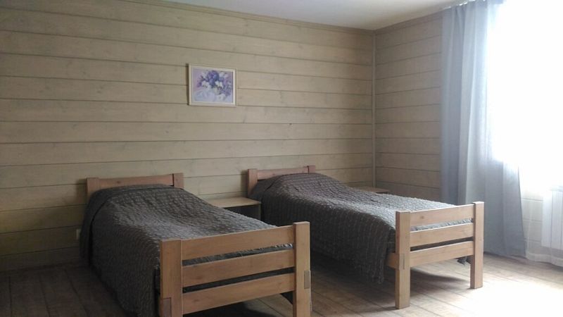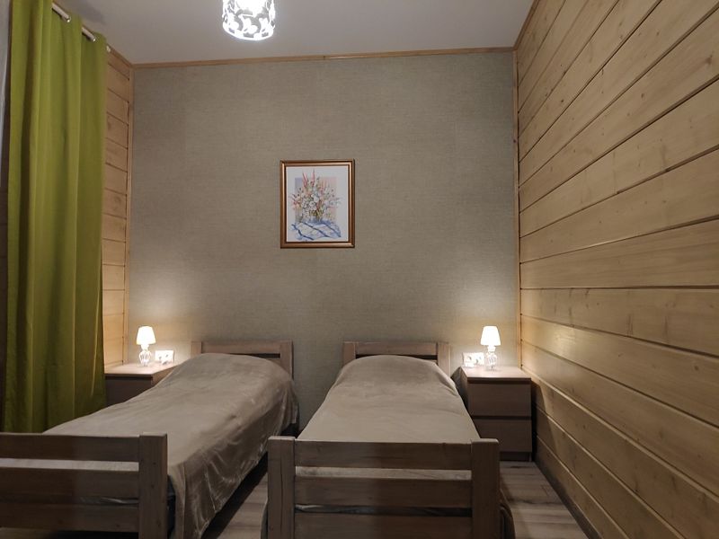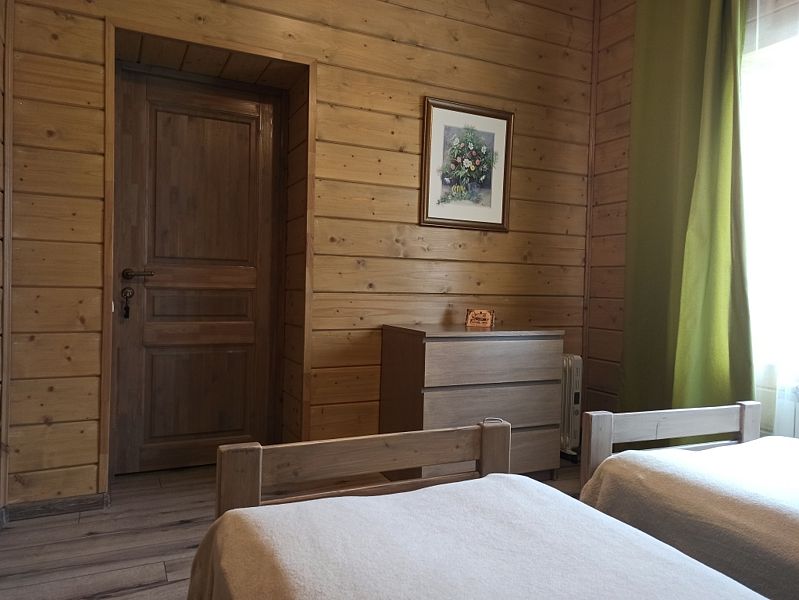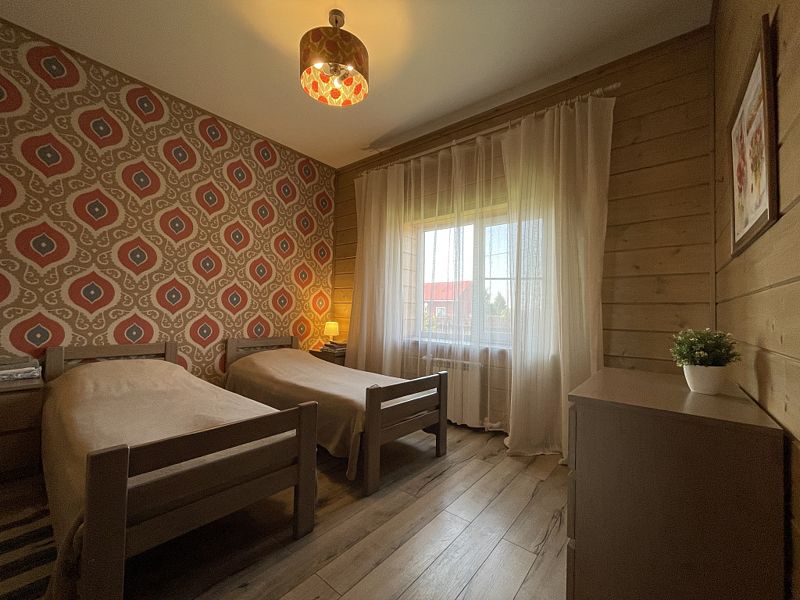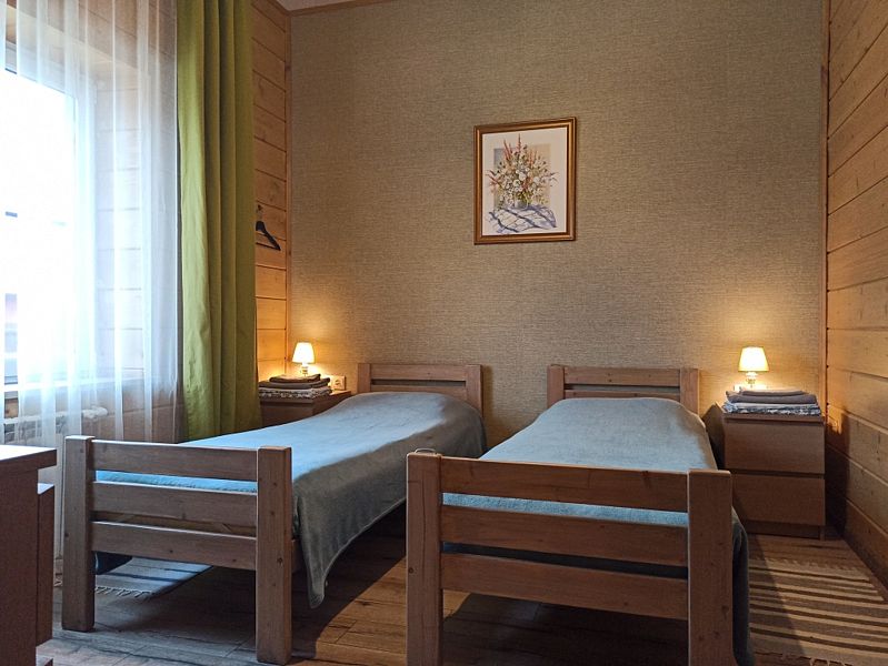 Номер двумя односпальными кроватями и общим санузлом. Находится на втором этаже дома из пяти комнат. В доме есть просторная кухня-гостиная с холодильником, посудомоечной машиной и всем необходимым для приготовления и приема пищи.