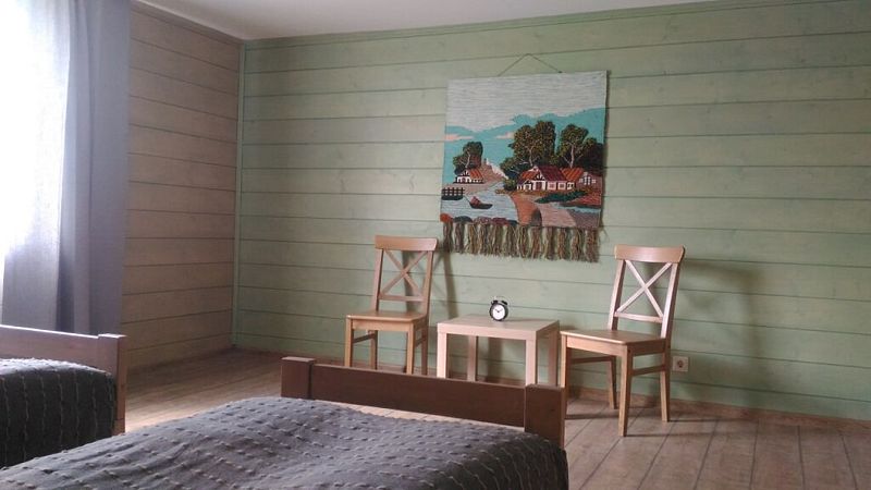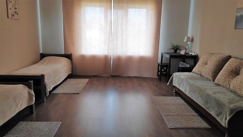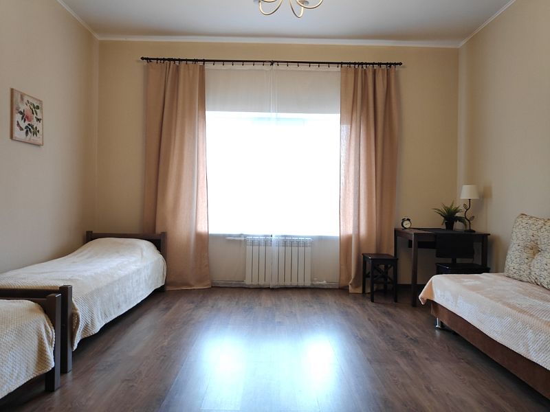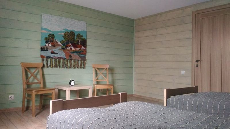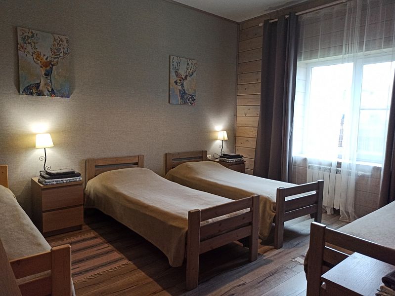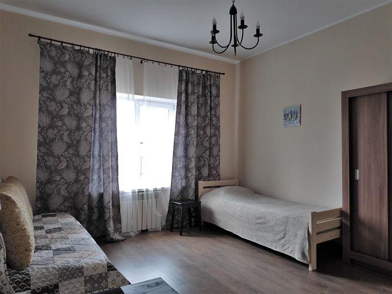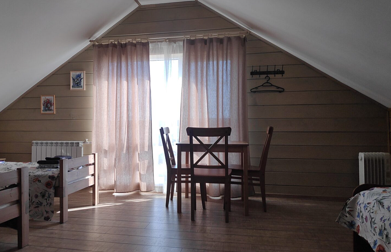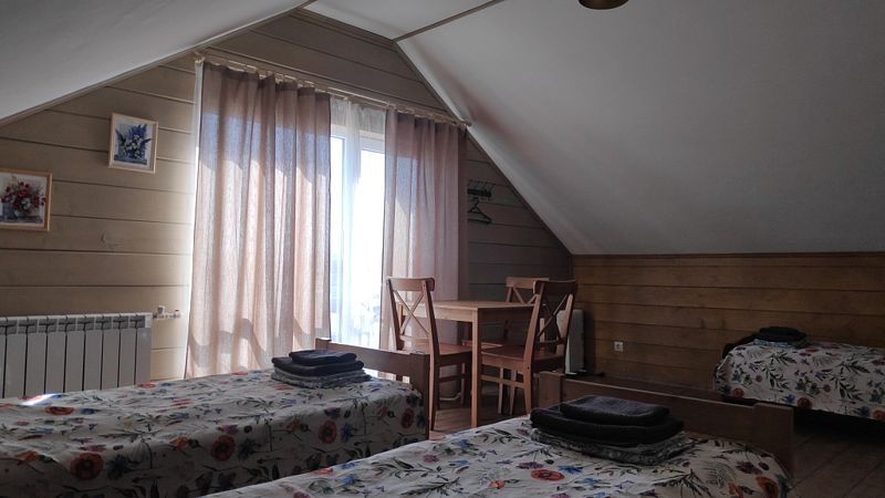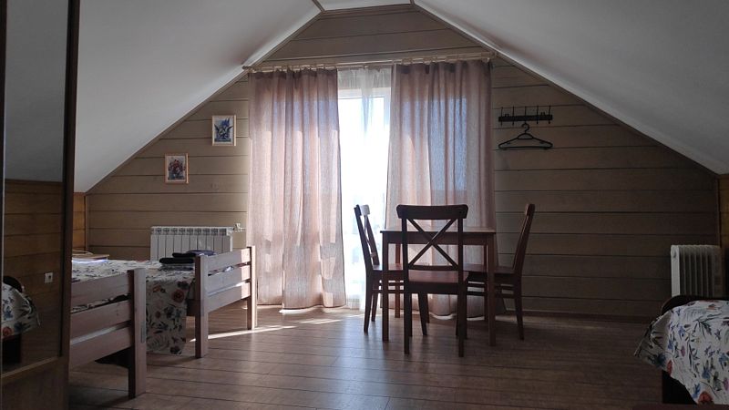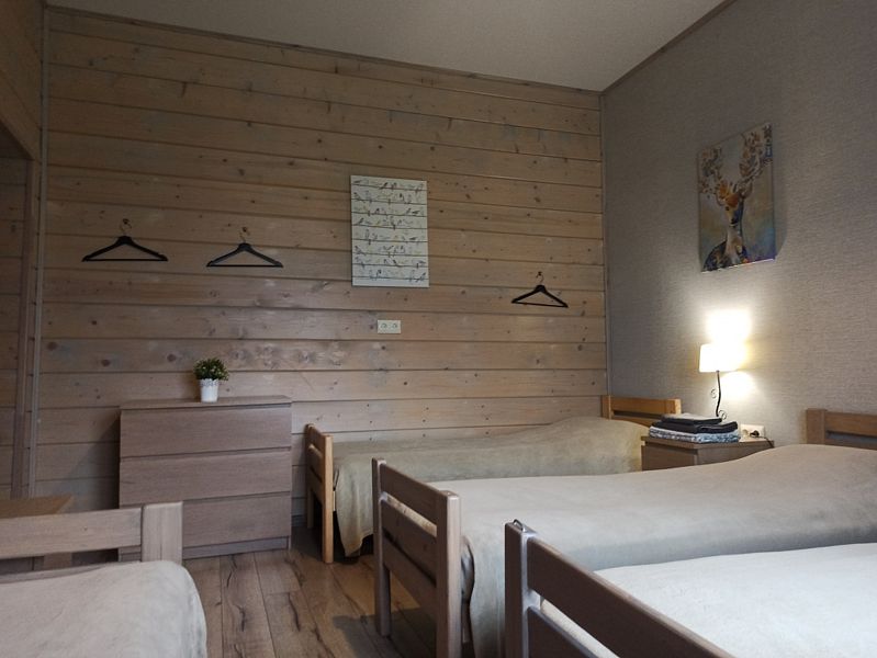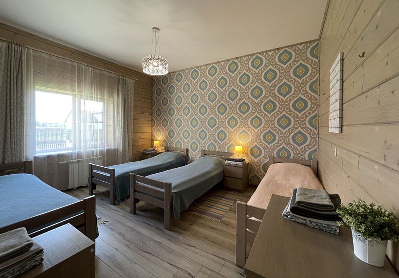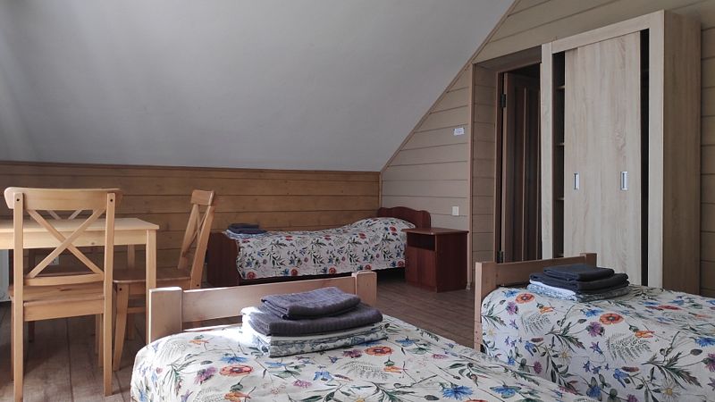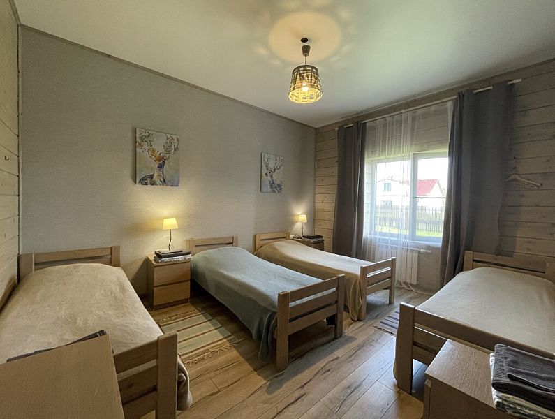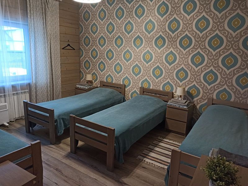 Номер с двухместным диваном-кроватью и двумя односпальными кроватями. Находится на первом этаже дома из пяти комнат. Санузел общий. В доме есть просторная кухня-гостиная с холодильником, посудомоечной машиной и всем необходимым для приготовления и приема пищи.