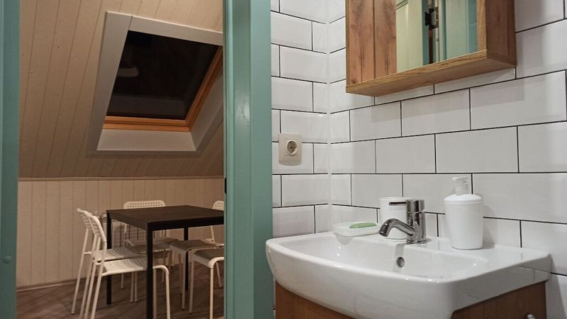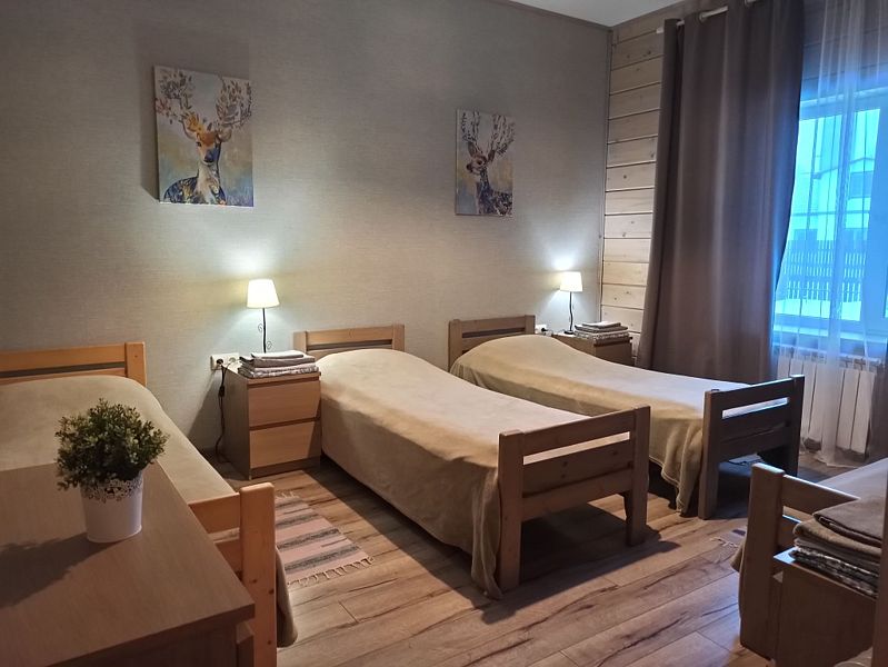 Номер с тремя односпальными кроватями и общим санузлом. Находится на втором этаже дома из пяти комнат. В доме есть просторная кухня-гостиная с холодильником, посудомоечной машиной и всем необходимым для приготовления и приема пищи.