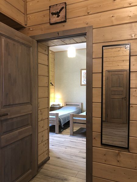 Номер с двумя односпальными кроватями в доме из трех комнат. Общая ванная комната в холле перед номером. В доме есть просторная кухня-гостиная с холодильником, посудомоечной машиной и всем необходимым для приготовления и приема пищи.