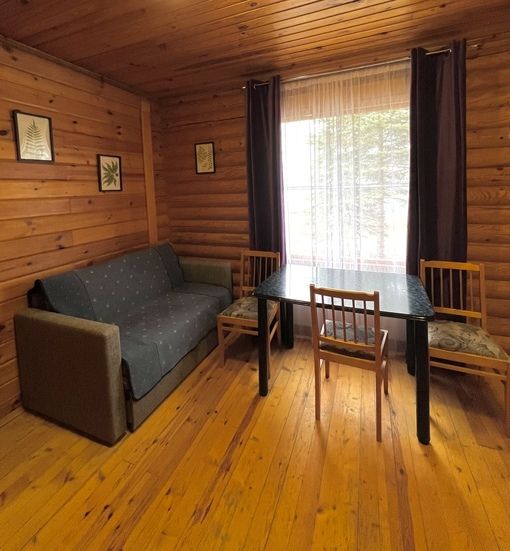 Номер расположен на первом этаже второго корпуса. В гостиной стоит удобный диван, обеденный стол, холодильник, микроволновая печь, телевизор, электрический чайник и комплект посуды (тарелки, чашки, стаканы, столовые приборы). В спальне - двухспальная кровать и шкаф.