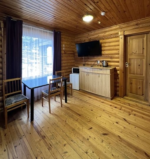 Номер расположен на первом этаже второго корпуса. В номере стоит двухспальная кровать, диван, шкаф, обеденный стол, холодильник, микроволновая печь, телевизор, электрический чайник и комплект посуды (тарелки, чашки, стаканы, столовые приборы).