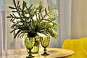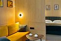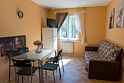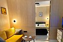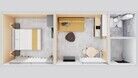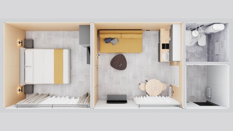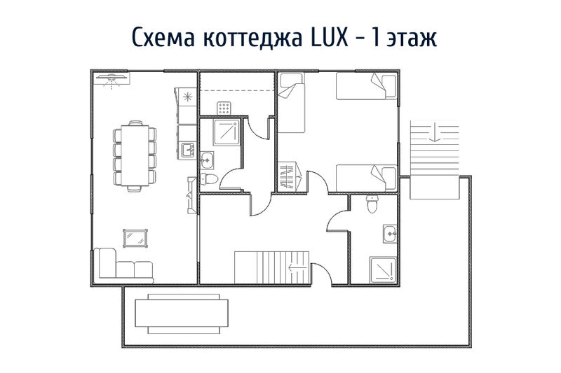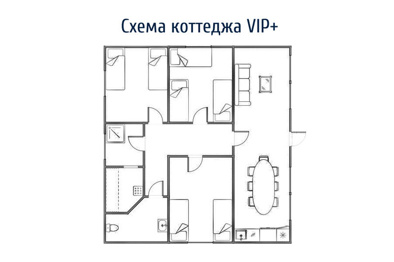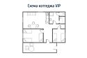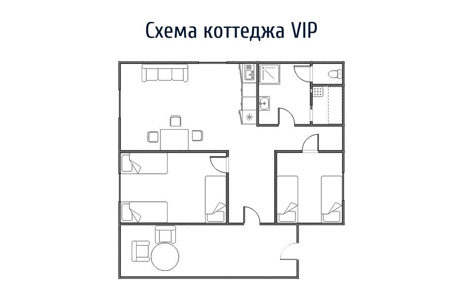 Одноэтажный домик, состоящий из небольшой веранды, спален и гостиной, совмещенной с кухней. В гостиной стоят стол и стулья, два дивана.