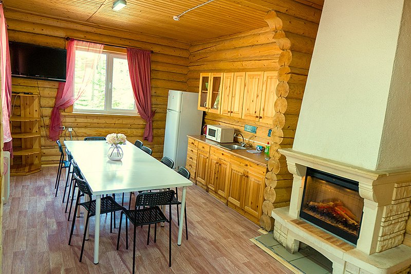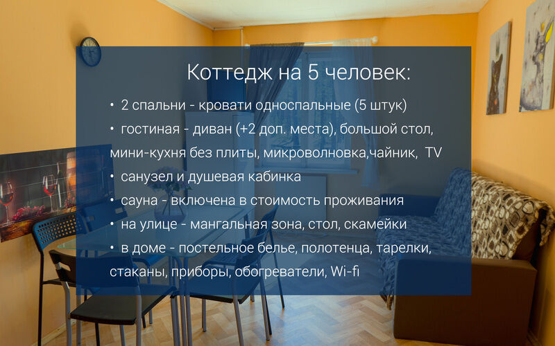 В доме 5 спален, 3 с/у, сауна, мини - кухня, микроволновка, чайник, телевизор, холодильник, обогреватели.