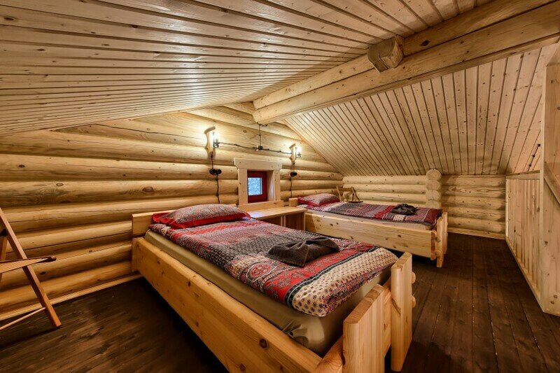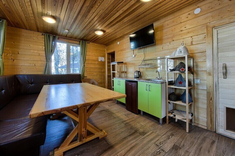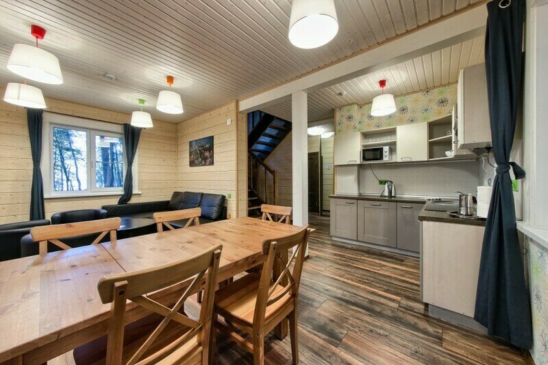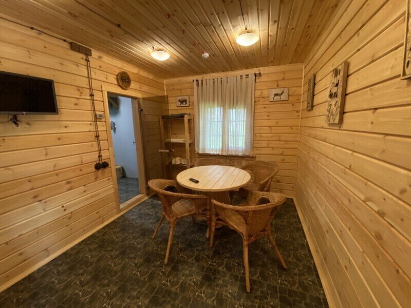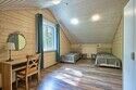 Уютный деревянный коттедж в Карельском стиле. Домики расположены в глубине леса на сосновой аллее. Терраса с зоной барбекю. На первом этаже гостиная зона с раскладывающимся диваном, кухня, ТВ, журнальным столиком, шкафом. На кухне есть все необходимое: холодильник, варочная поверхность, микроволновая печь, электрический чайник, вся необходимая посуда. Второй этаж — это просторная уютная мансарда с двумя односпальными кроватями. Площадь дома 40 кв.м.