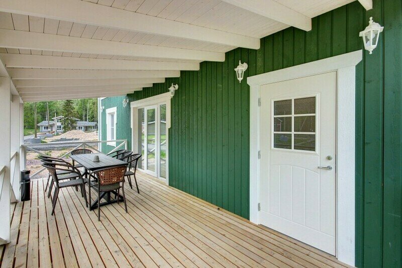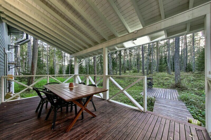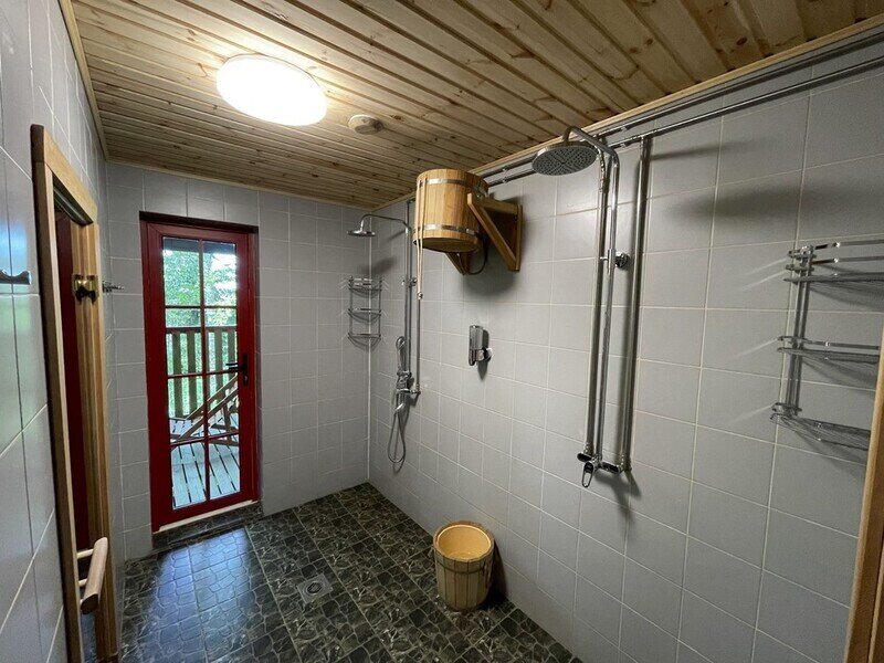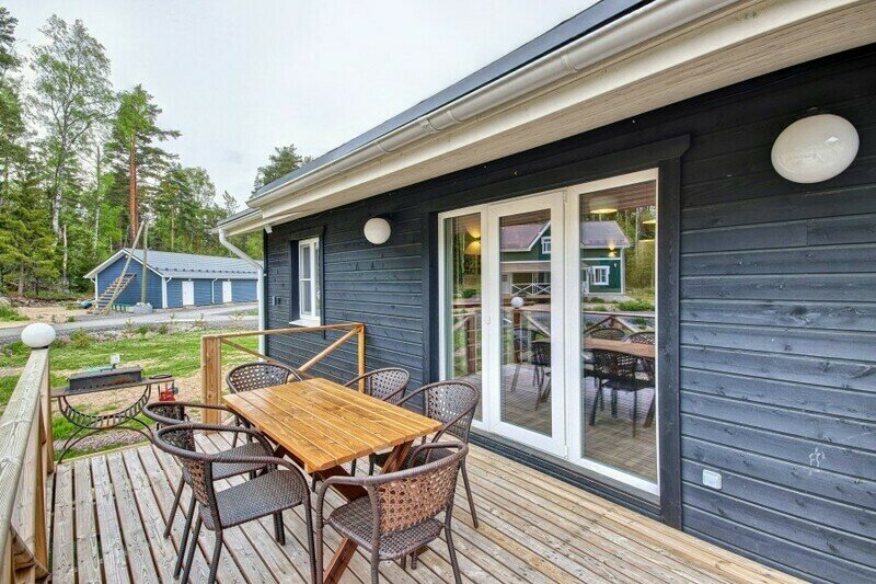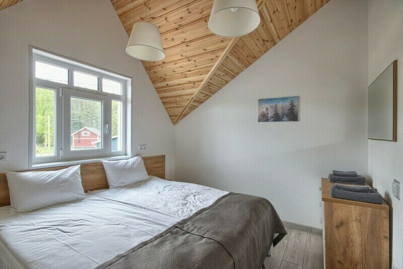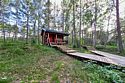 Двухэтажный коттедж с 2 спальнями и дровяной сауной. Расположен у природного ручья. Просторная терраса с мебелью и зоной для барбекю. Первый этаж состоит из просторной прихожей, кухни-гостиной, ванной комнаты, которая включает в себя раздельный туалет, умывальник с двумя раковинами, душевую комнату с двумя душами, дровяную сауну. На втором этаже две просторные спальни (20 м.кв.), санузел. Коттедж оборудован всем необходимым: холодильник, варочная панель, посудомоечная машина, микроволновая печь, чайник, комплект посуды, фен, стиральная машина, диван, мангал. Комфортное размещение до 6 человек. Общая площадь коттеджа 120 м.кв.