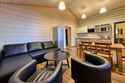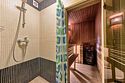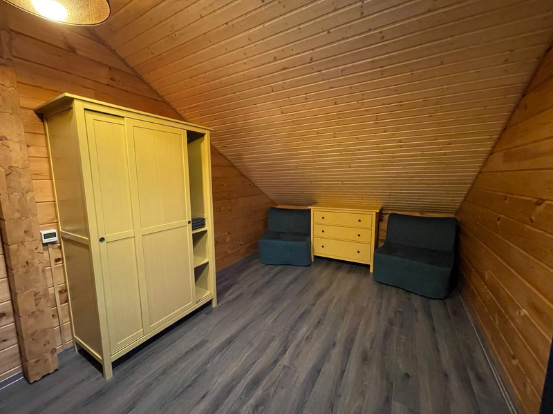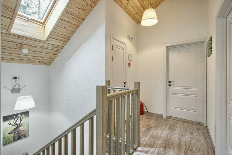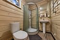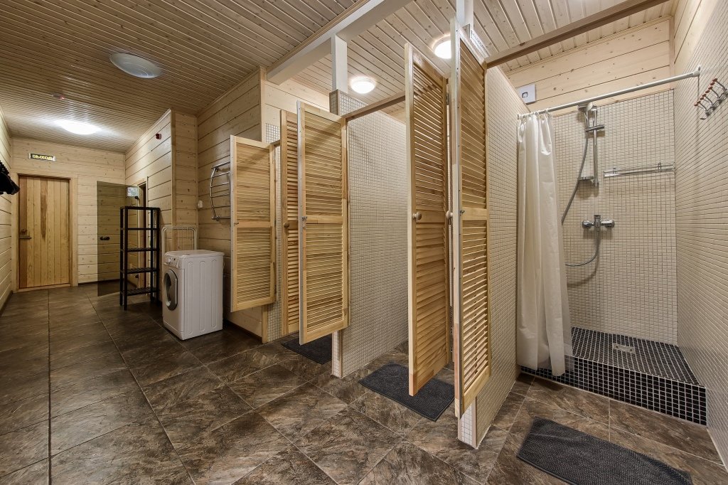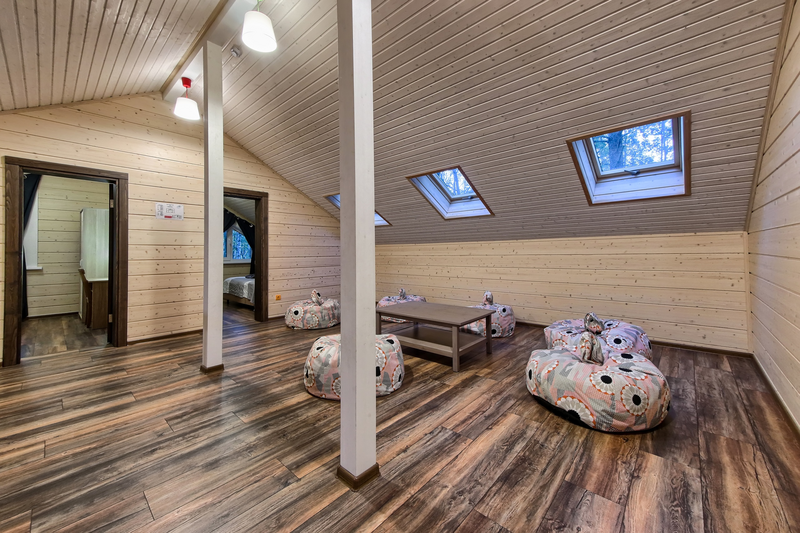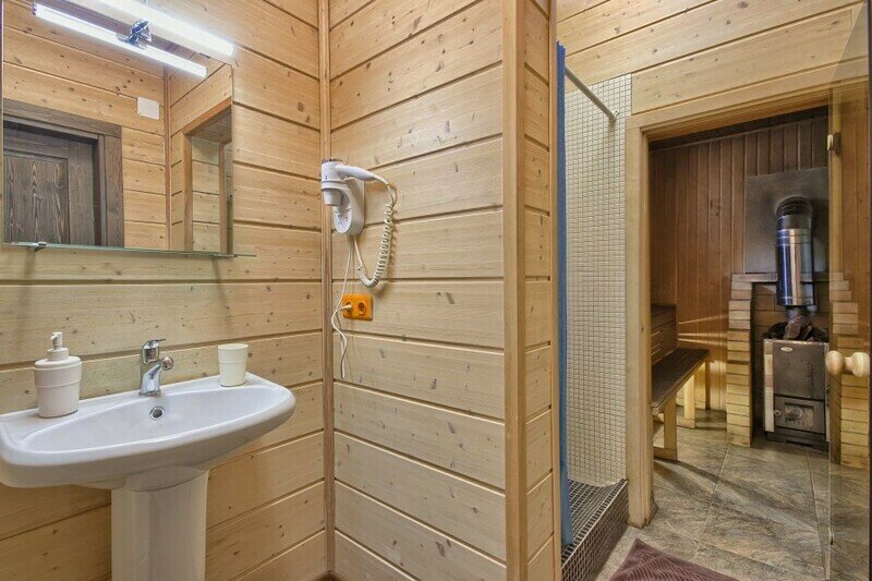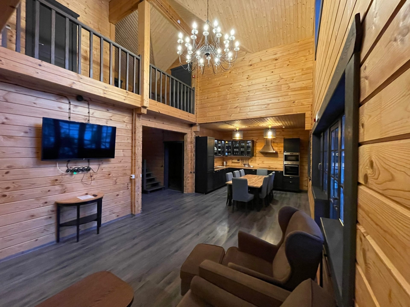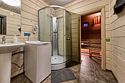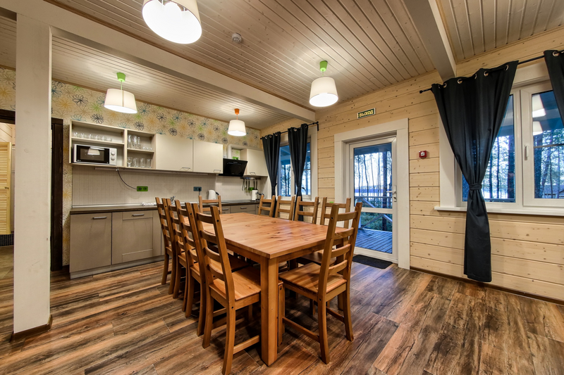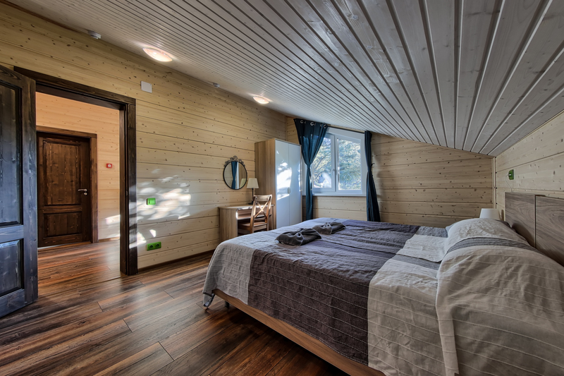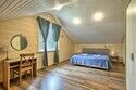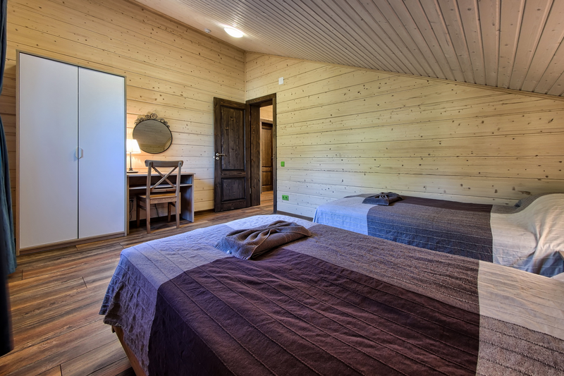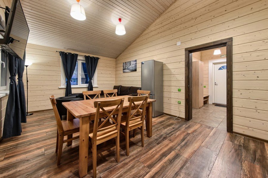 Двухэтажный коттедж с 5 спальнями и дровяной сауной. Расположен недалеко от ресепшена и центральной площади базы отдыха. Первый этаж коттеджа состоит из просторной прихожей, кухни-гостиной, ванной комнаты, которая включает в себя 2 раздельных туалета, 2 раковины, душевую комнату с 3 душами, дровяную сауну. На втором этаже пять спален и ванная комната с душевой кабиной. Коттедж оборудован всем необходимым: холодильник, варочная панель, посудомоечная машина, микроволновая печь, чайник, комплект посуды, фен, стиральная машина, вся необходимая мебель, мангал. Общая площадь коттеджа 217 м.кв.