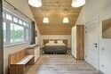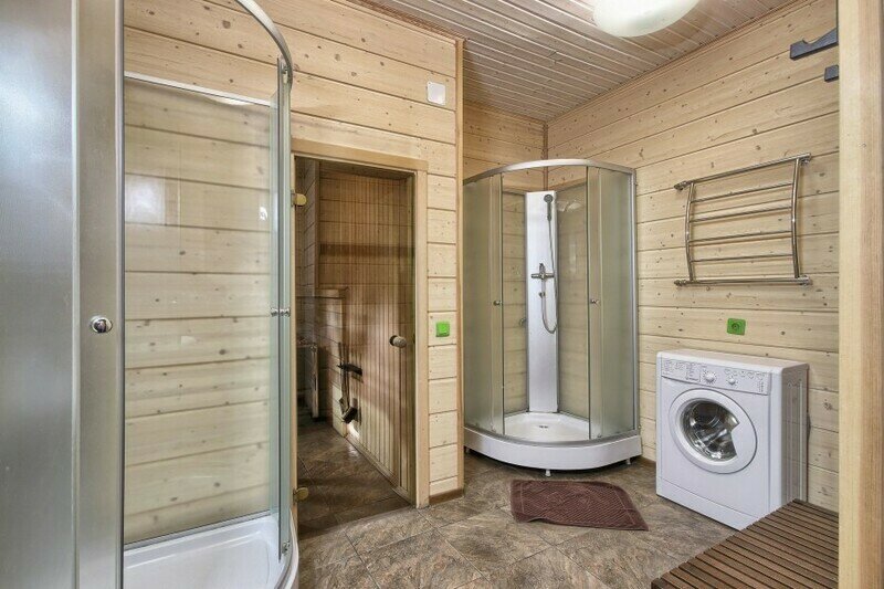 Двухэтажный коттедж с 5 спальнями и дровяной сауной. Первый этаж коттеджа состоит из прихожей, кухни-гостиной, ванной комнаты, которая включает в себя 2 раздельных туалета, 2 раковины, душевая комната с двумя душами, дровяную сауну и одну спальню. На втором этаже четыре спальни, два санузла, зона для отдыха с пуфами. Коттедж оборудован холодильником, варочной панелью, посудомоечной машиной, микроволновой печью, чайником, комплектом посуды, феном, стиральной машиной, всей необходимой мебелью, мангалом. Общая площадь коттеджа 205 м.кв.
