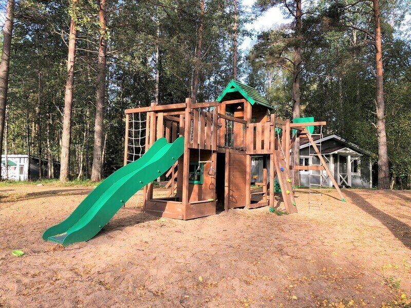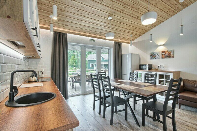 Одноэтажный коттедж с дровяной сауной. Расположен недалеко от детской площадки. Коттедж состоит из просторной прихожей, кухни-гостиной, ванной комнаты. Также, на первом этаже расположены две спальни. Есть второй выход на просторную террасу с видом на лес. На кухне есть все необходимое для комфортного проживания, холодильник, варочная панель, посудомоечная машина, микроволновая печь, чайник, комплект посуды, фен, стиральная машина, вся необходимая мебель, мангальная зона. Комфортное размещение до 6 человек. Общая площадь коттеджа 85 м.кв.