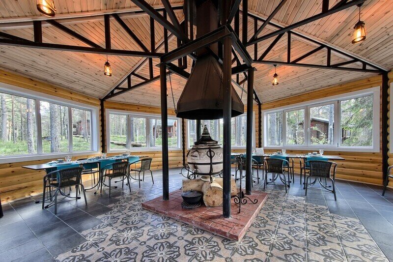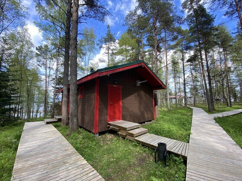 База расположена на берегу Ладожского озера, домики находятся на расстоянии друг от друга, по всей базе деревянные дорожки. Территория очень красивая, прекрасный воздух. Домики оборудованы всем необходимым, кроме продуктов питания. Поэтому планируя свой отдых, посетите в магазин. Но если вы что-то забыли, то на ресепшен есть магазинчик с тем, о чем "не подумали". Здесь вы можете насладиться очень вкусным кофе от производителя Cape Coffe (узнавала для себя) и френч догом «на перекусить». И наивкуснейшее мороженое). Все домики оборудованы мангальной зоной. Даже если вы арендовали апартаменты, то есть мангалы на территории. Да, чуть не забыла- банька чудесна!
