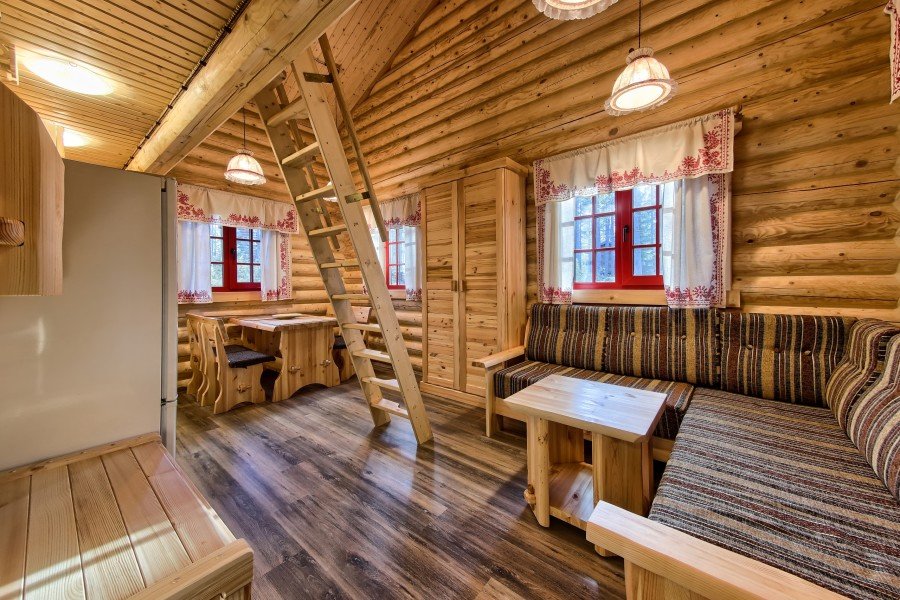В веже расположена печь, двуспальный матрас, постельные принадлежности и полотенца для двоих. Умывальник (без горячей воды) и биотуалет. Два пуфа, журнальный столик, мини холодильник, электрический чайник, бокалы, одноразовая посуда. Панорамная терраса с садовой мебелью.