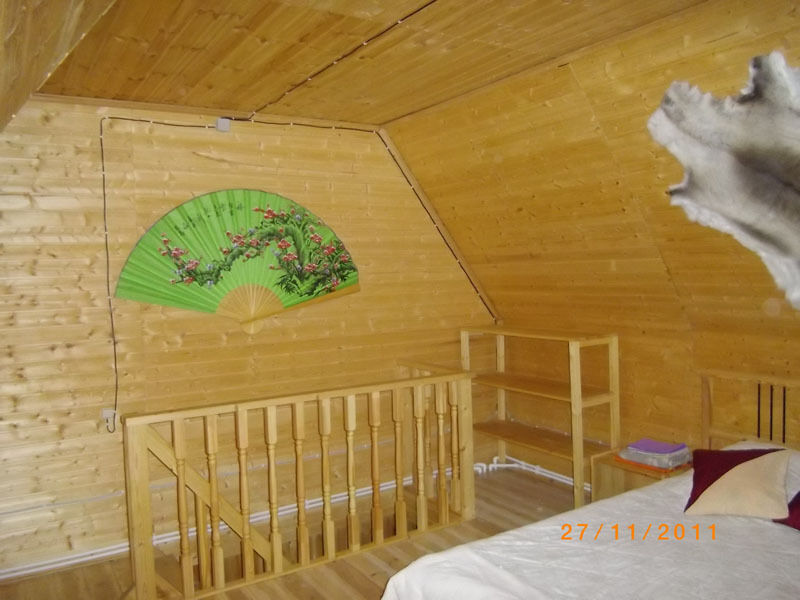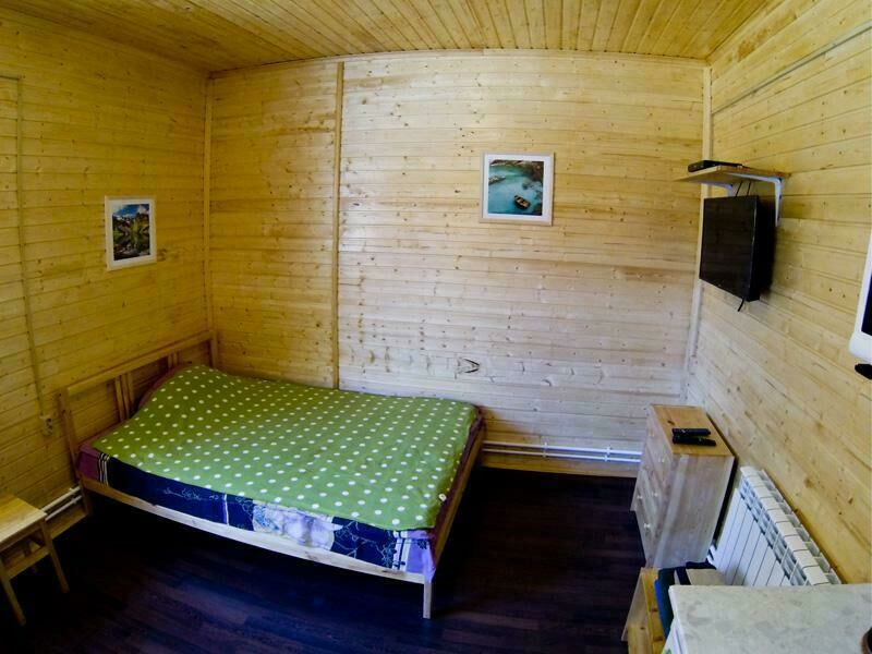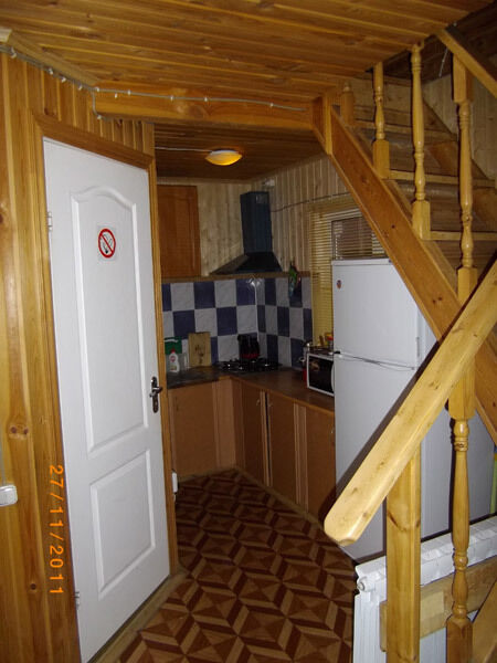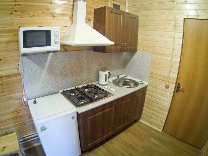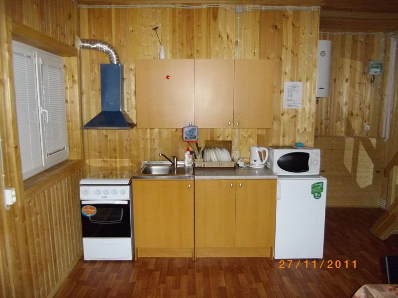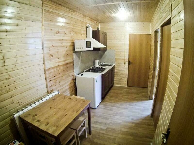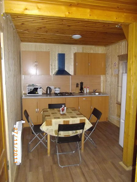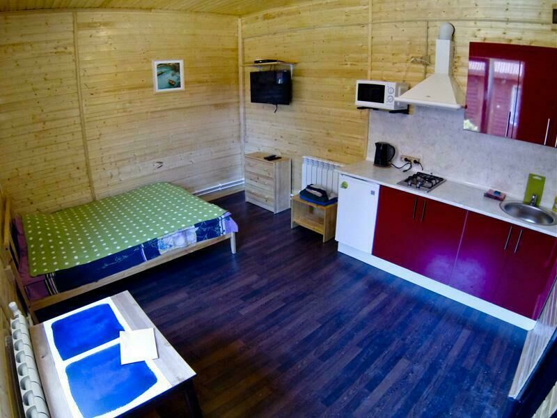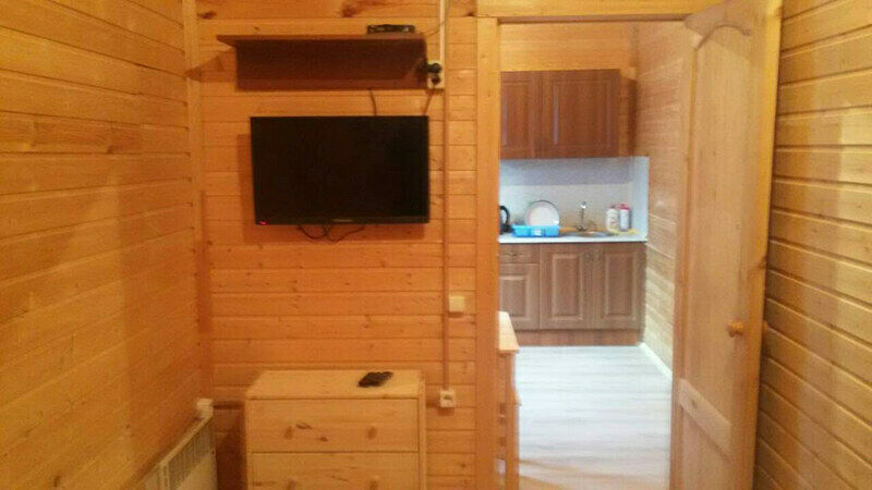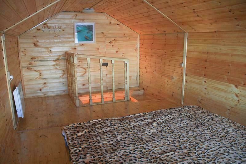Первый этаж: Сделан на подобии однокомнатной квартиры студии, 2-х спальная кровать, ТВ, полностью оборудованная кухня, холодильник, плита, СВЧ, эл. чайник, посуда. Сан. узел с душевой кабиной.