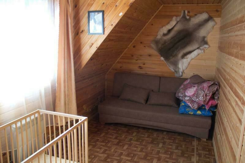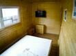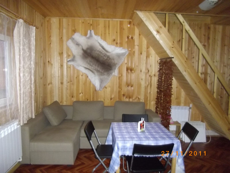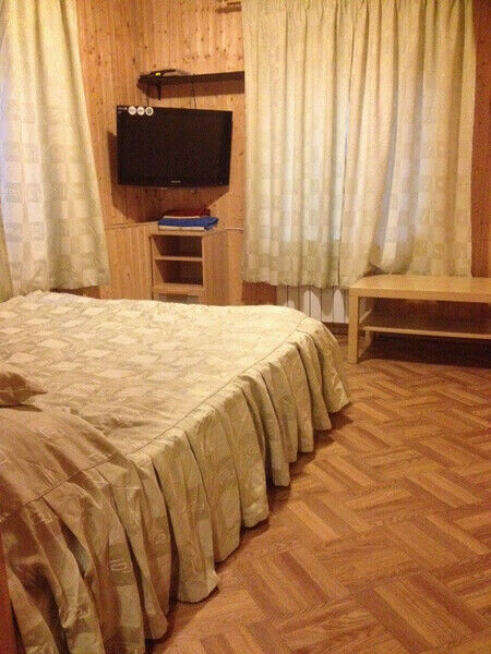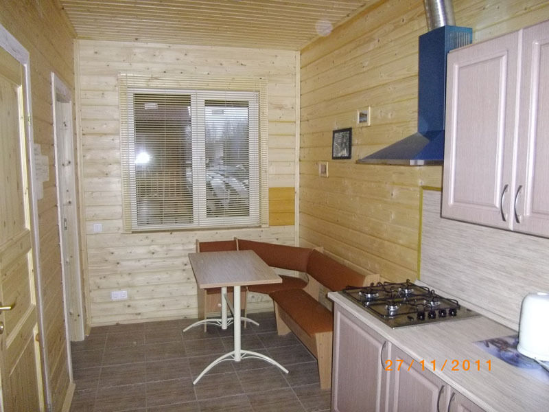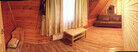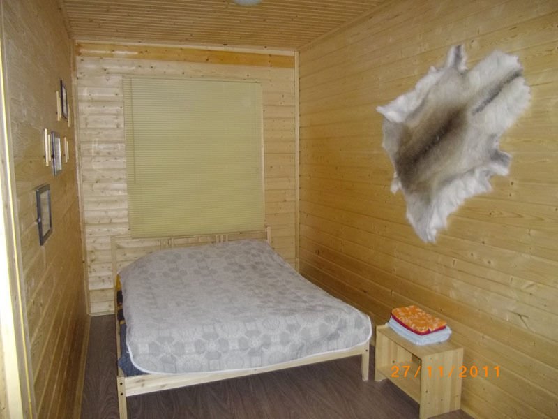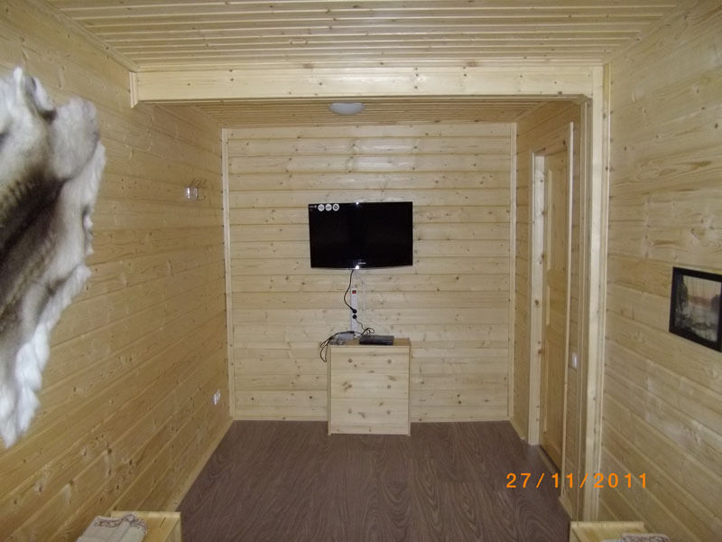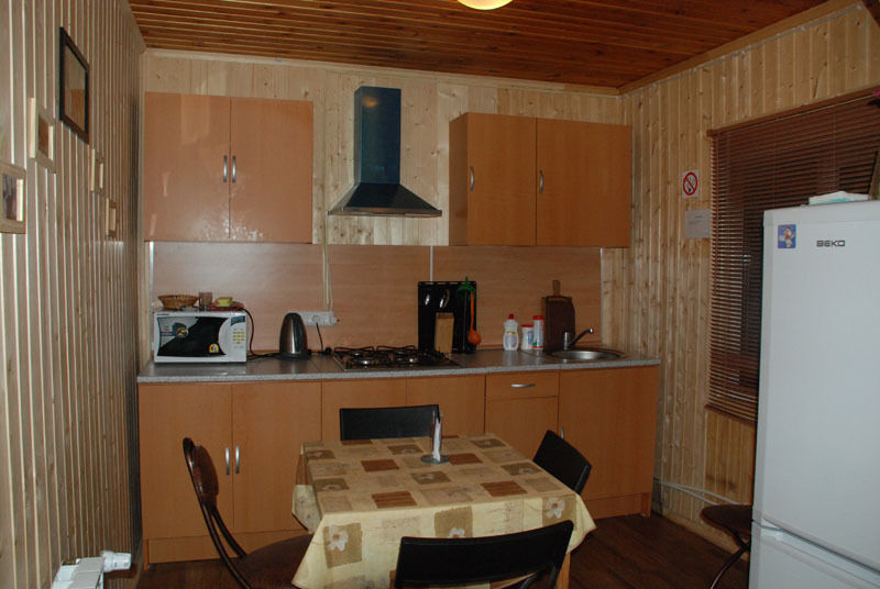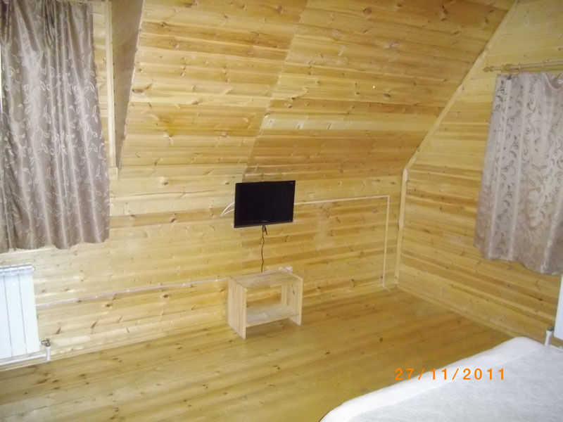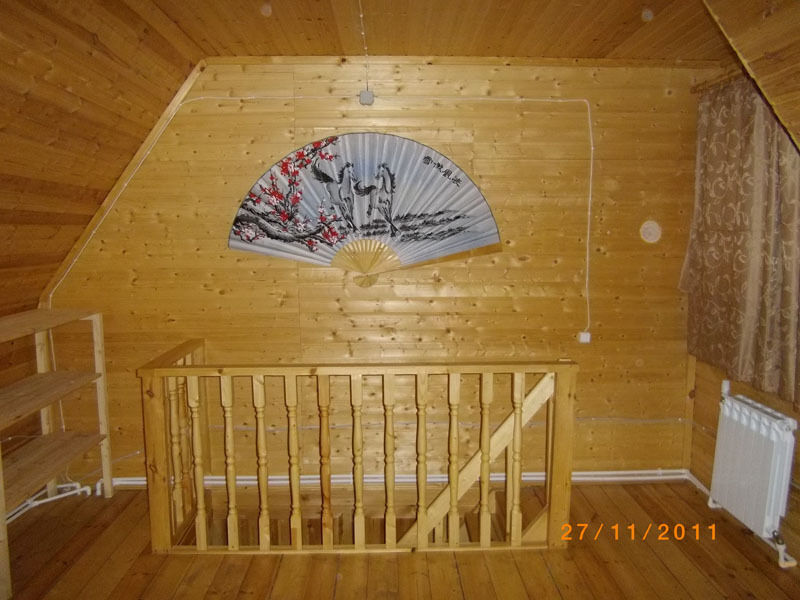 Первый этаж: Сделан на подобии однокомнатной квартиры студии, 2-х спальная кровать, ТВ, полностью оборудованная кухня, холодильник, плита, СВЧ, эл. чайник, посуда. Сан. узел с душевой кабиной.