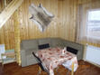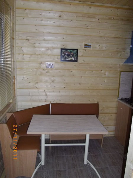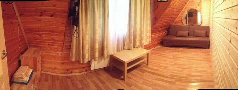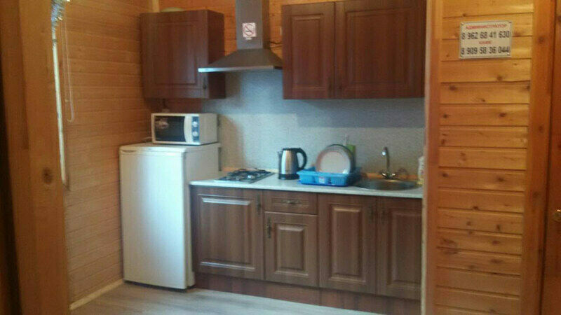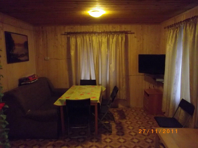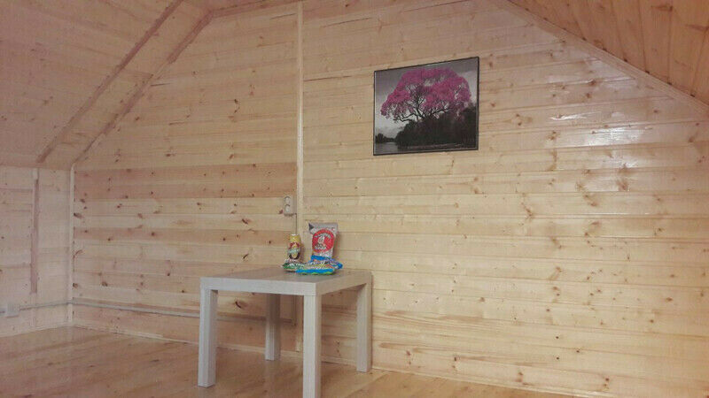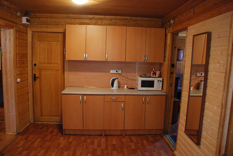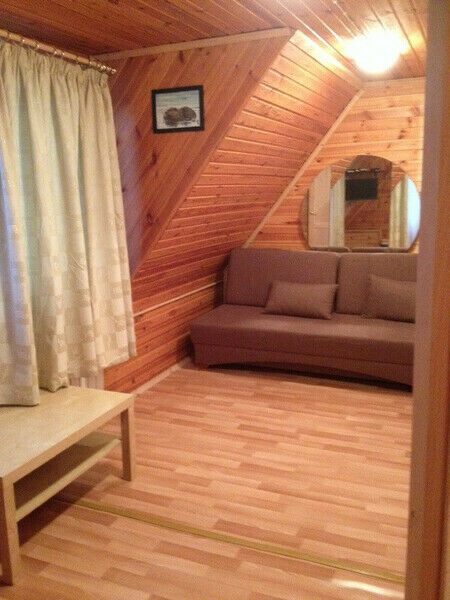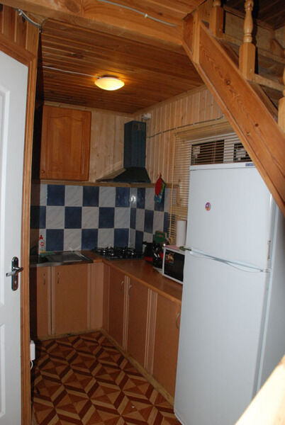 Первый этаж: Сделан на подобии однокомнатной квартиры студии, 2-х спальный диван, телевизор, полностью оборудованная кухня, холодильник, плита, СВЧ, эл. чайник, посуда. Сан. узел с душевой кабиной.